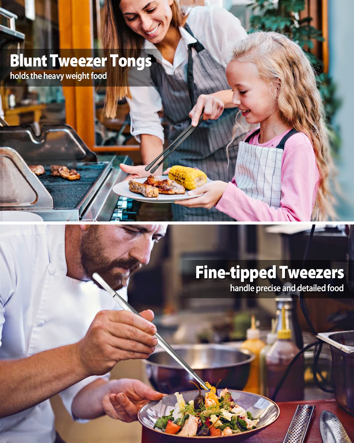 - 2 TYPES TWEEZER TONGS: The tip of the first type of tweezer is blunt enough to be safe to touch or even press, and holds the food securely, minimizing the risk of food slipping and sliding. The second tweezers have a fine-tipped design to help chefs create delicate dishes. The grooved handle avoids clips from slipping during greasy kitchen work. Serrated teeth hold items firmly with their tips, which enables them to grip things tightly and not let them fall