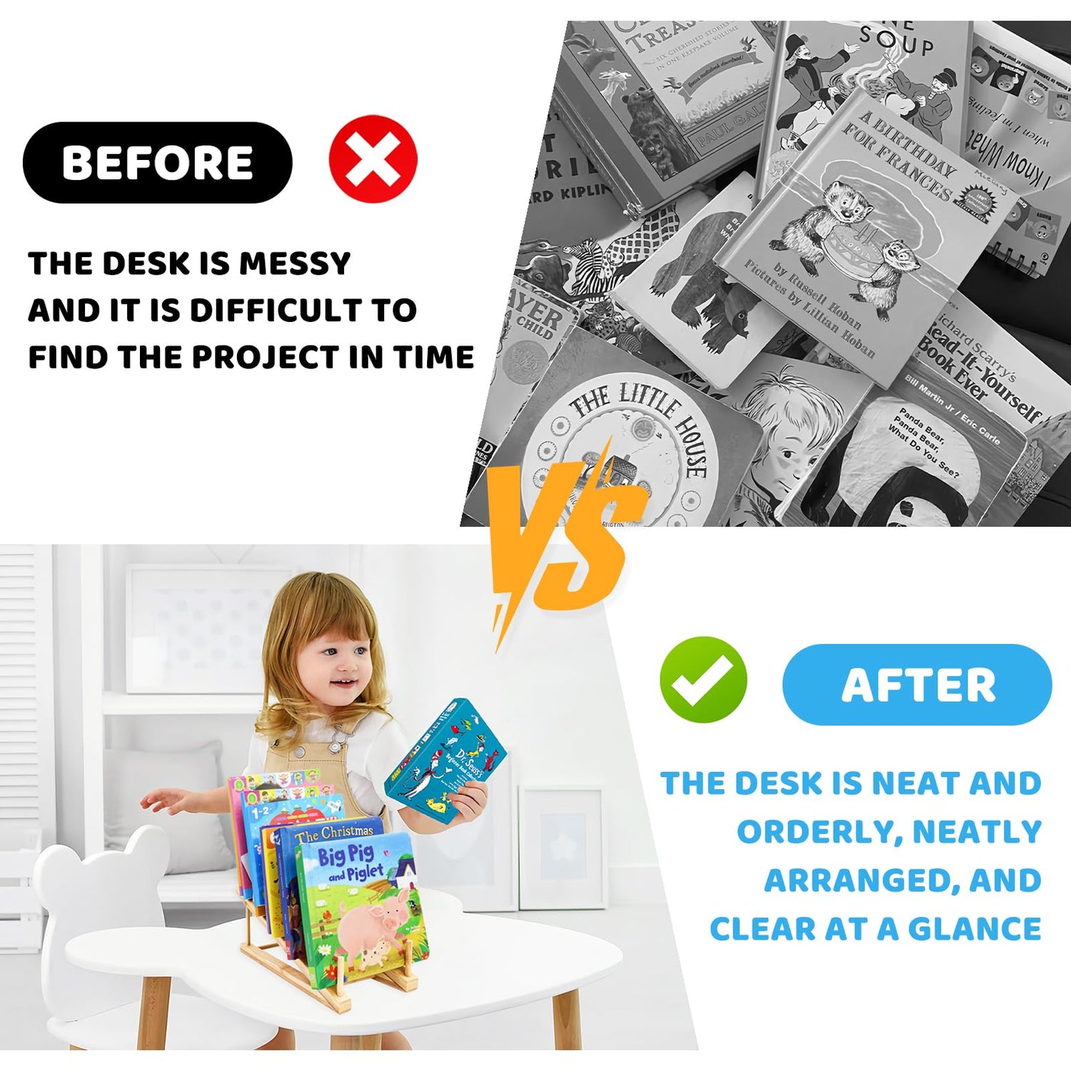 - EASY TO INSTALL: You only need to insert 2 wooden sticks in the middle into the holes on the shelves on both sides and then check whether it is stable before you use it. It fits most table tops and other surfaces, it is easy to set up and adjust. The triangular structure ensures stability, even when children enthusiastically pull out their books.