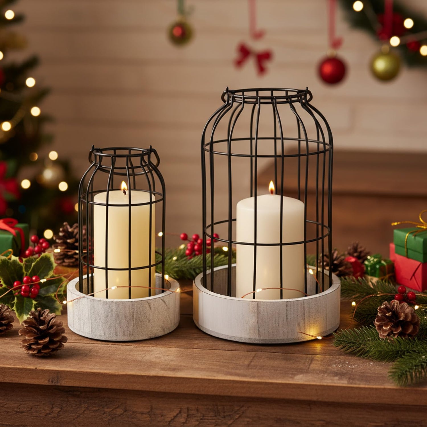 - 【Modern Farmhouse Lanterns For All Season】- Liven up your home decor with these lanterns that have a modern farmhouse aesthetic. The set of two lantern candle holders is an excellent addition to any room, and you can even add seasonal accents for Halloween, Christmas, and other occasions. The rustic finish with the stylish metal wire and wooden stands in a distressed white look makes them a stylish choice for any decor.