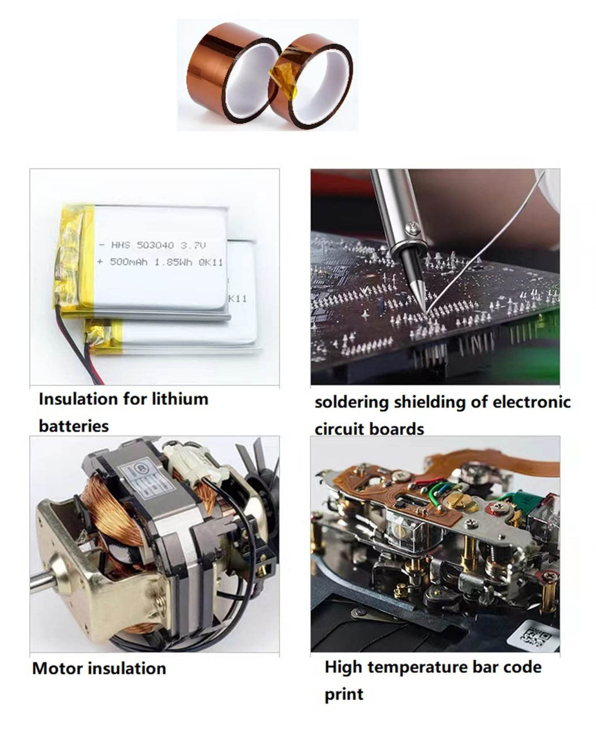 - It is suitable for wave soldering shielding of electronic circuit boards, protection of gold finger and electrical insulation, motor insulation, positive and negative poles of lithium batteries. Ideal for protecting sensitive printed circuit board components such as gold leads and gold fingers during wave soldering. It is also widely used in the electronics industry for electrical insulation of transformers, motors, coils, capacitors and inverter power supplies.