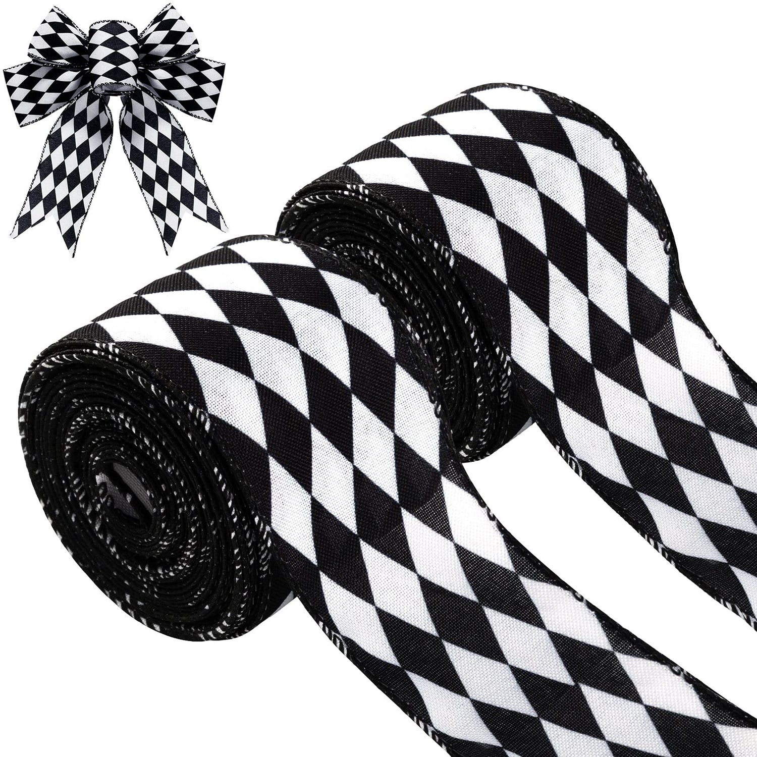 2 Rolls Christmas Checkered Ribbon Black and White Check Ribbon Diamond Check Wired Edge Ribbon Diamond Pattern Decorative Ribbons for Christmas Fall Tree Wrapping DIY Crafts (2.6 Inch)