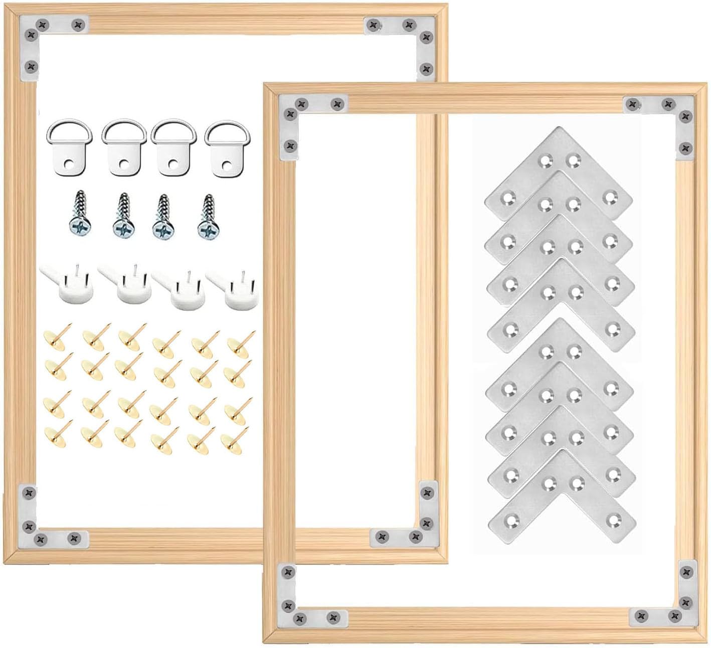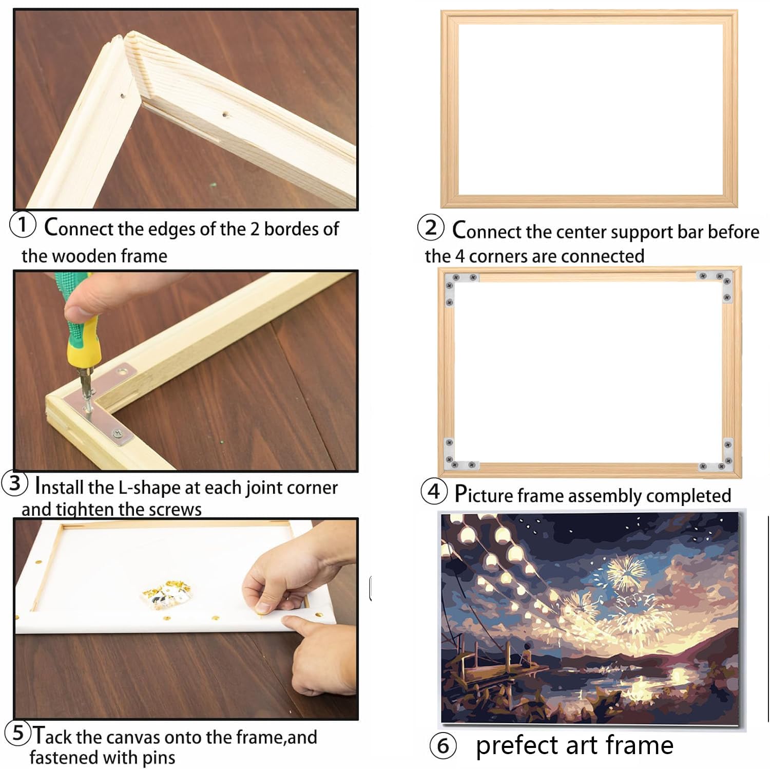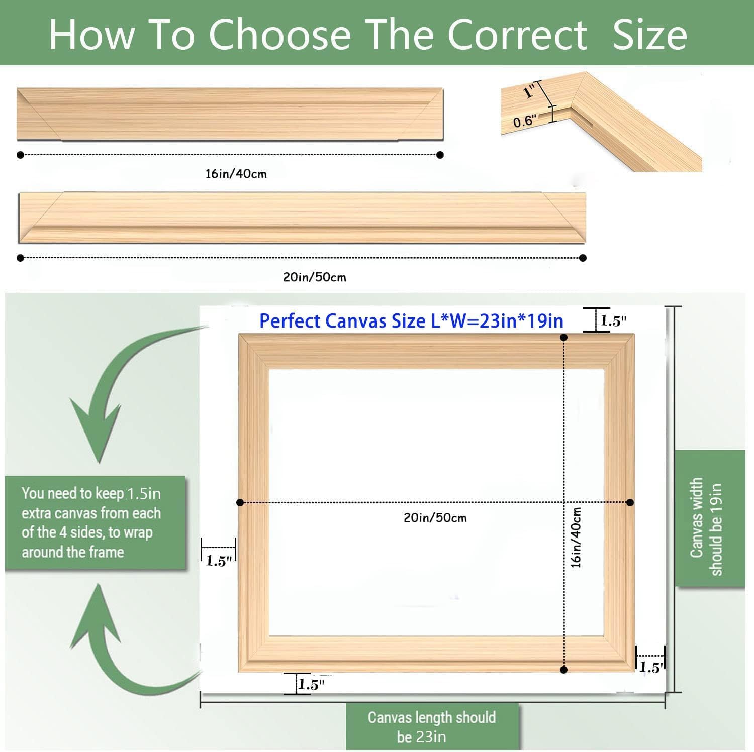 - Packing List:You will receive stretcher bars kit include 4 pcs16in wooden bars,4 pcs 20in wooden bars,8 pcs corner codes ,32 screws and some flat-head thumbtacks, We also offer hanging accessories such as seamless nails and hooks as a supplement to your purchase to make it easier to hang the frame later.