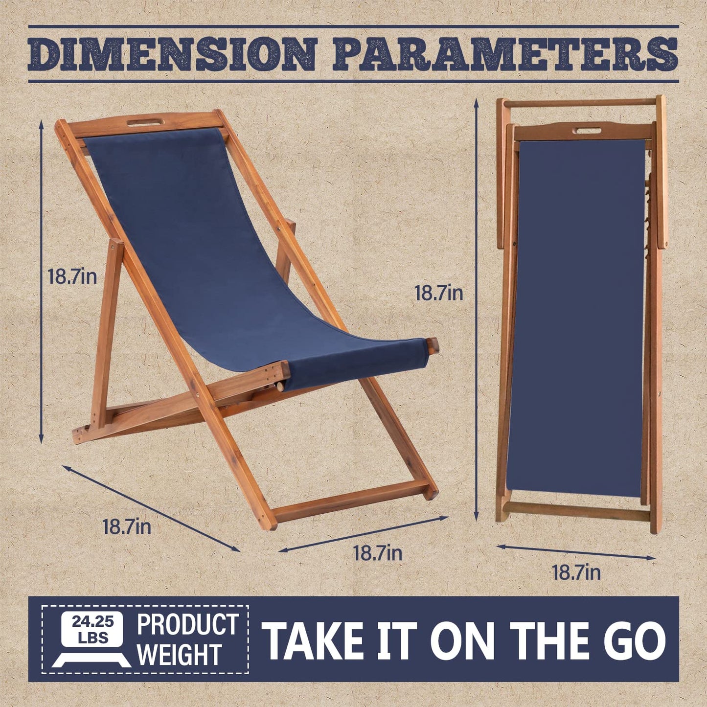 2 Set Outdoor Wooden Patio Lounge Chair Beach Sling Chair Set Height Portable Reclining Beach Chair Solid Wood Frame with White Polyester Canvas 3 Level,Blue