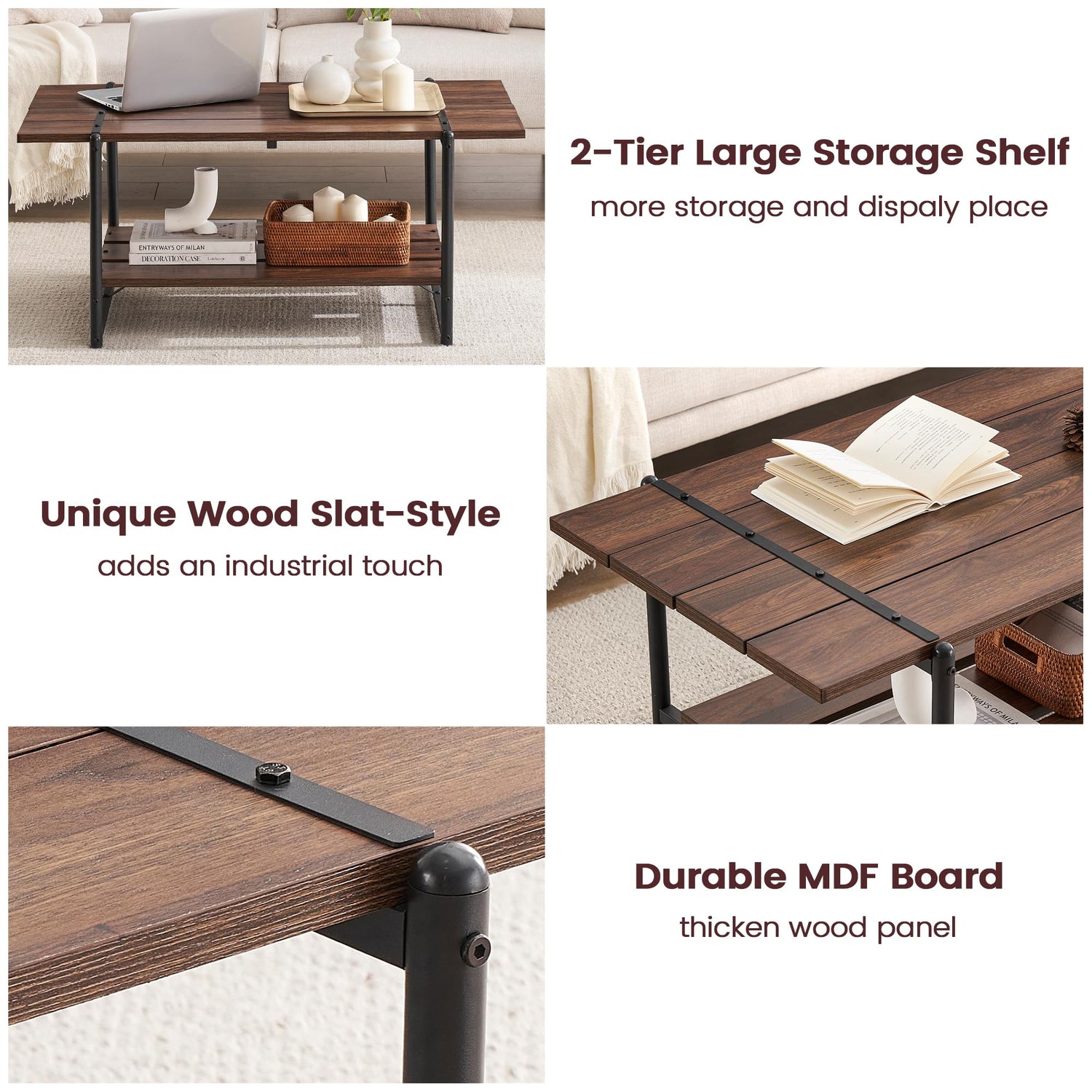 2-Tier Farmhouse 41'' Large Gray Wood Coffee Table with Storage Shelf -Modern Rustic Metal Rectangle Center Living Room Coffee Table Accent Furniture for Home Office,Easy Assembly(Walnut Brown)