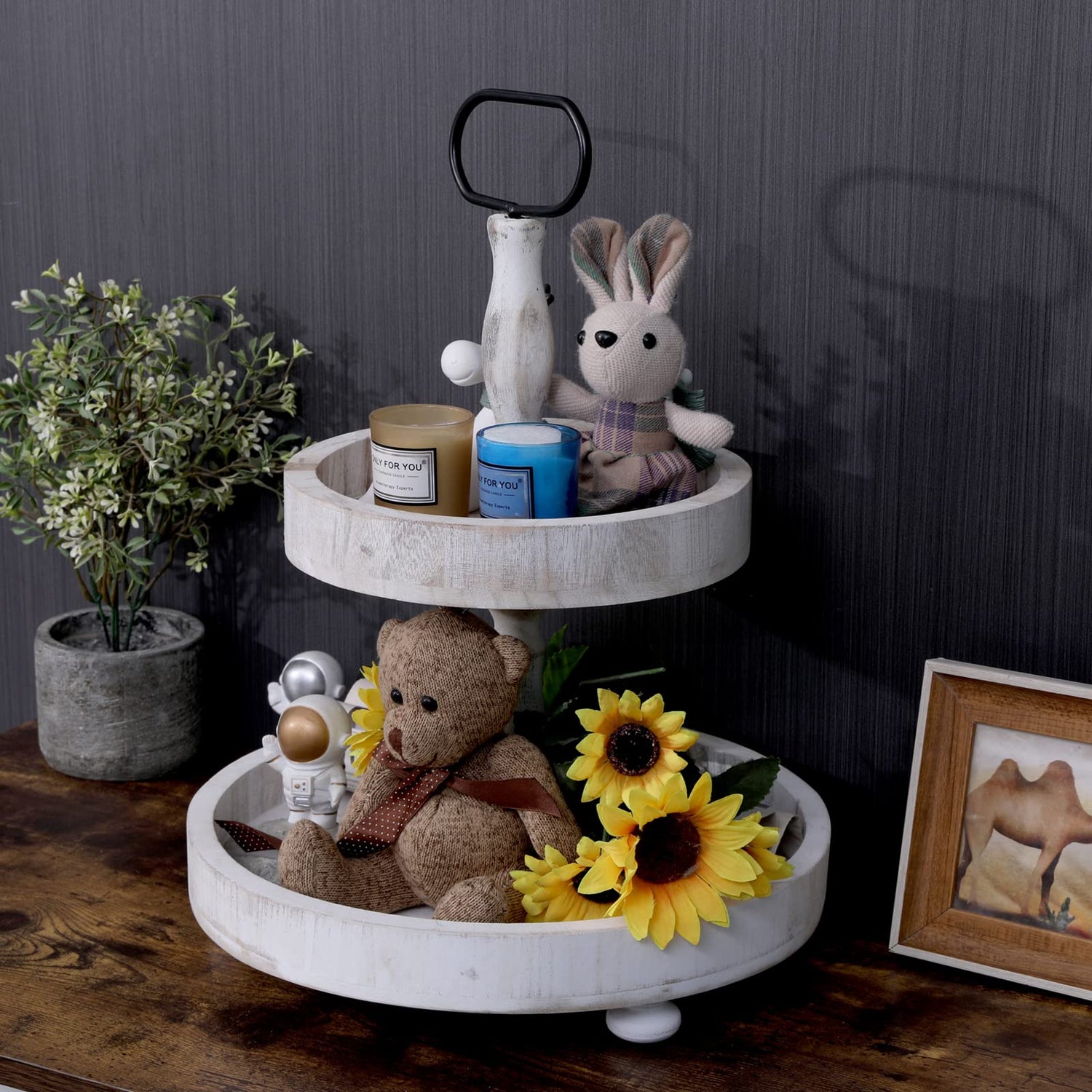 2 Tier Tray Rustic Cake Stand Farmhouse Kitchen Decor Centerpiece,Farmhouse 2 Tier Serving Tray with Handle for Coffee Bar