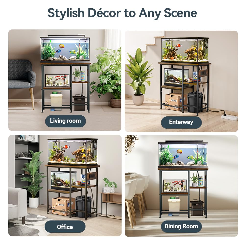 - 4-in-1 Power Outlet:Ditch the tangled cords! This stand features a convenient 4-in-1 power center with 2 AC and 2 USB outlets. You can choose to install it on the left or the right side of the stand! Power filters, heaters, lights, and charge devices effortlessly. Keep your aquarium area tidy and organized with this practical solution.