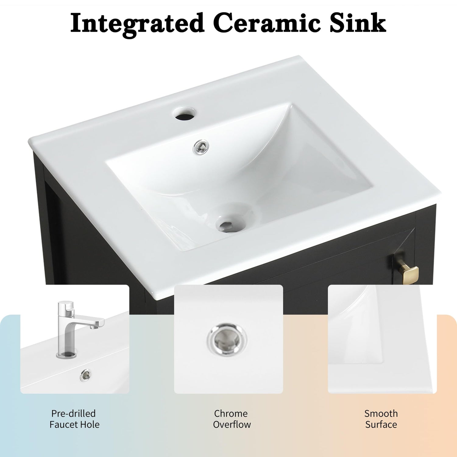20" Bathroom Vanities with Ceramic Sink, Storage Rack Shelf and One Drawer, Solid Wood & MDF Board, Black