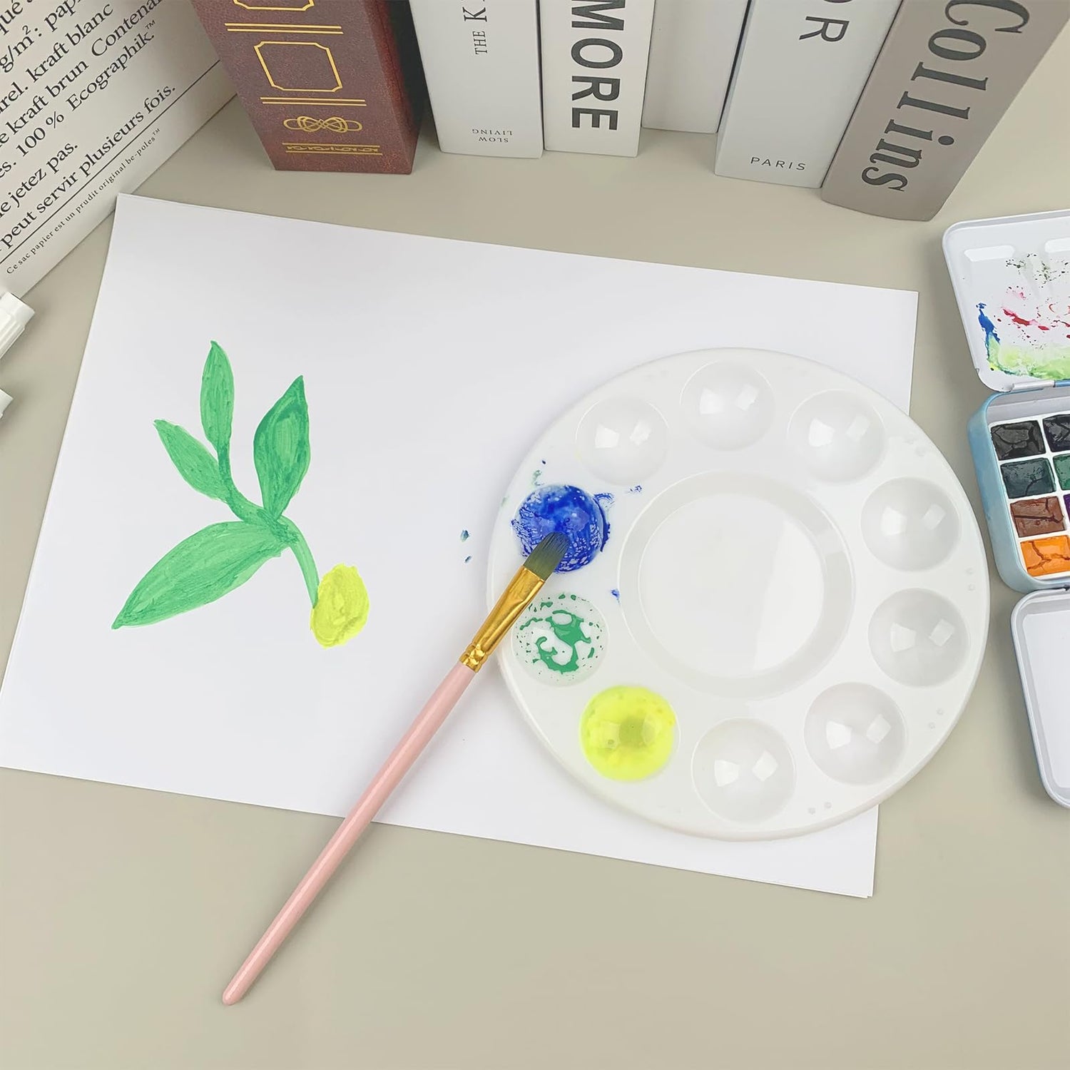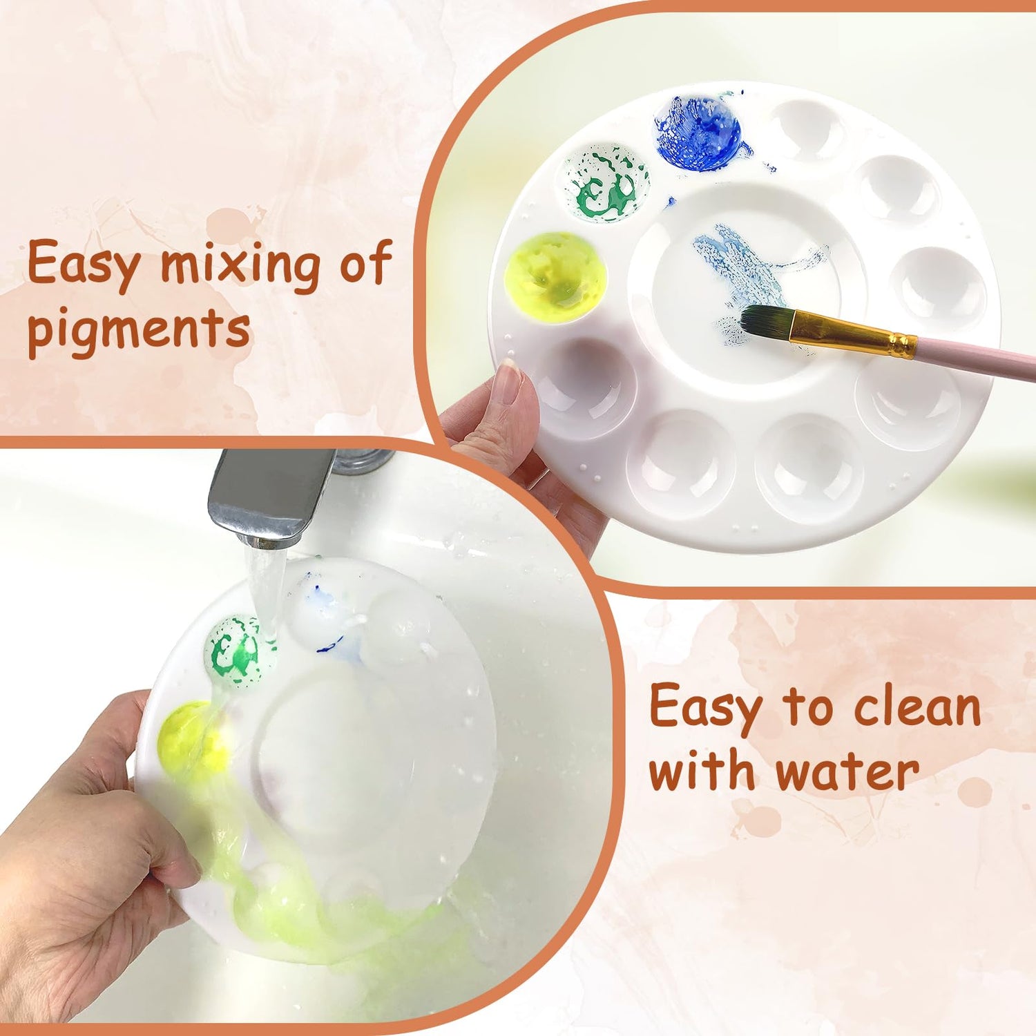 Details: This set of 20 white plastic paint trays is an ideal choice for kids and students, perfect for extensive painting needs. Each palette has an outer diameter of 170 mm (6.69 inches), offering a spacious area for mixing colors. Each palette features a central mixing area with an outer diameter of 78 mm (3.07 inches) and a depth of 8.63 mm (0.34 inches), along with 10 wells with an outer diameter of 32 mm (1.25 inches) and a depth of 10.04 mm (0.41 inches). Made of white, high-quality plastic, they are compact in size, easy to stack and carry, making them ideal for classroom painting, outdoor sketching, and other occasions.