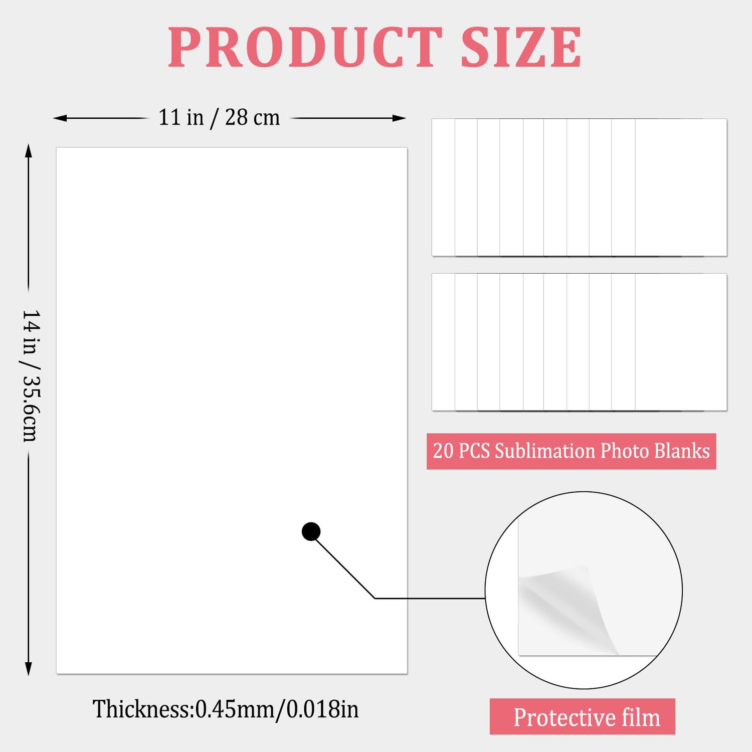 - 【Product Includes】You will get 20 pcs sublimation metal blanks, suitable for heat transferring photos or signs once you peel off the protective film. Each aluminium sublimation photo blanks measures 11x14 inches and is 0.45 mm/0.018 inches thick