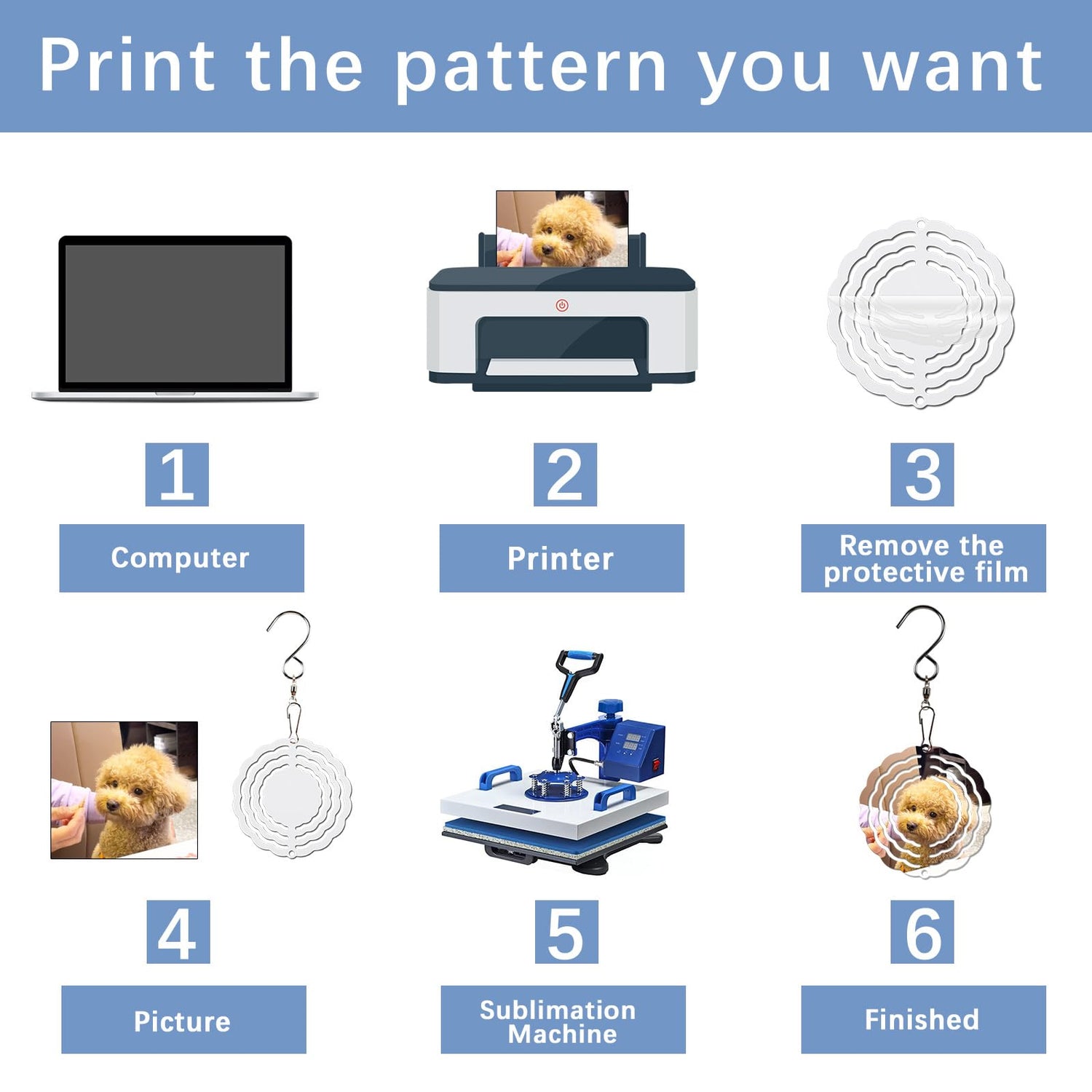 - 【Friendly Tips】These blank sublimation wind spinners have protective film on both sides. Please remove the protective film before printing the pattern. Sublimation parameters Temperature 185 degrees Celsius, time 90-120 seconds, medium pressure. If you have any questions about the sublimation project, please contact us.