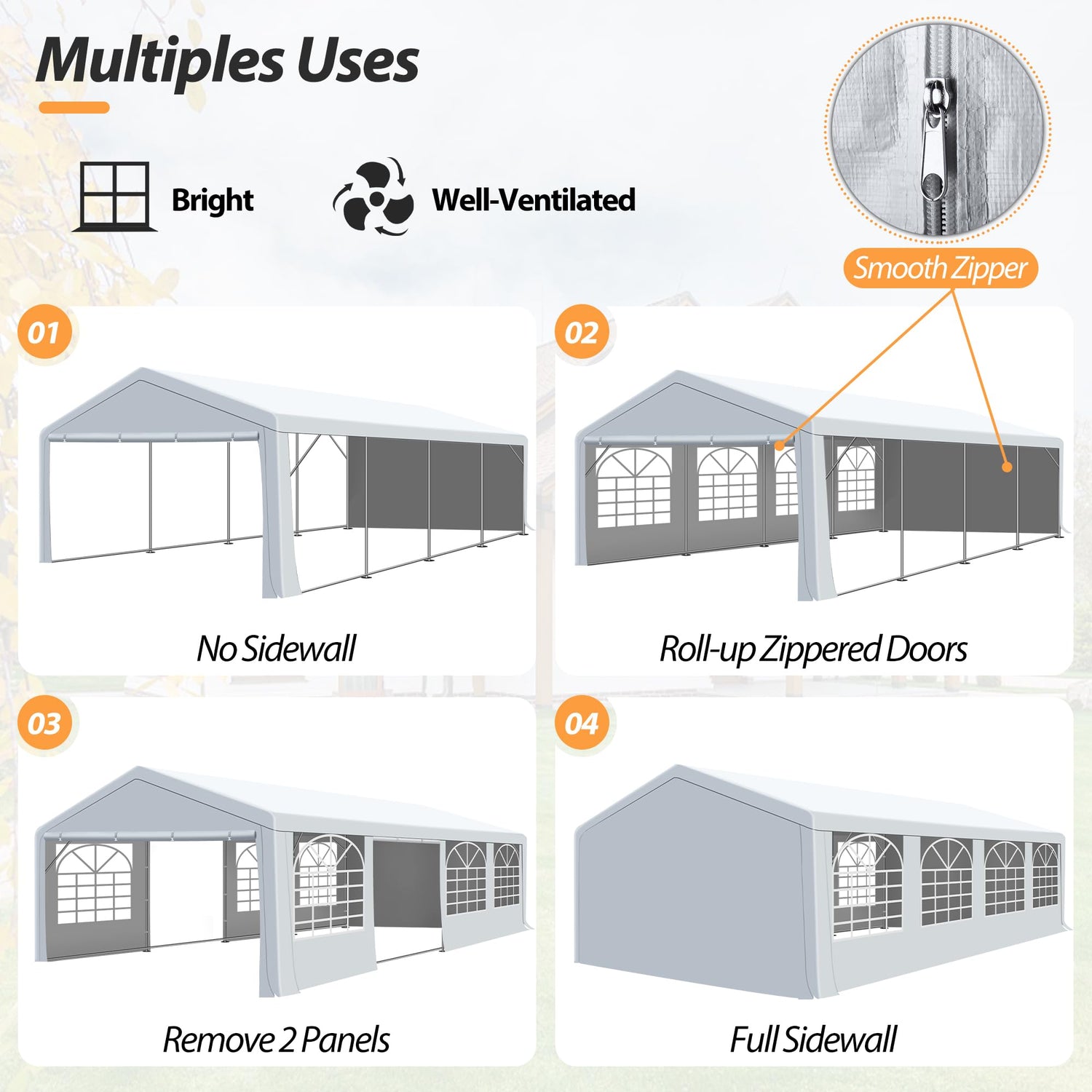 - VENTILATED DESIGN: Our party tent comes with 2 zipper doors that can be rolled up or remove to provide good ventilation and airflow in hot day. The sidewalls also are removable. It's perfect for hosting weddings, parties or corporate events.