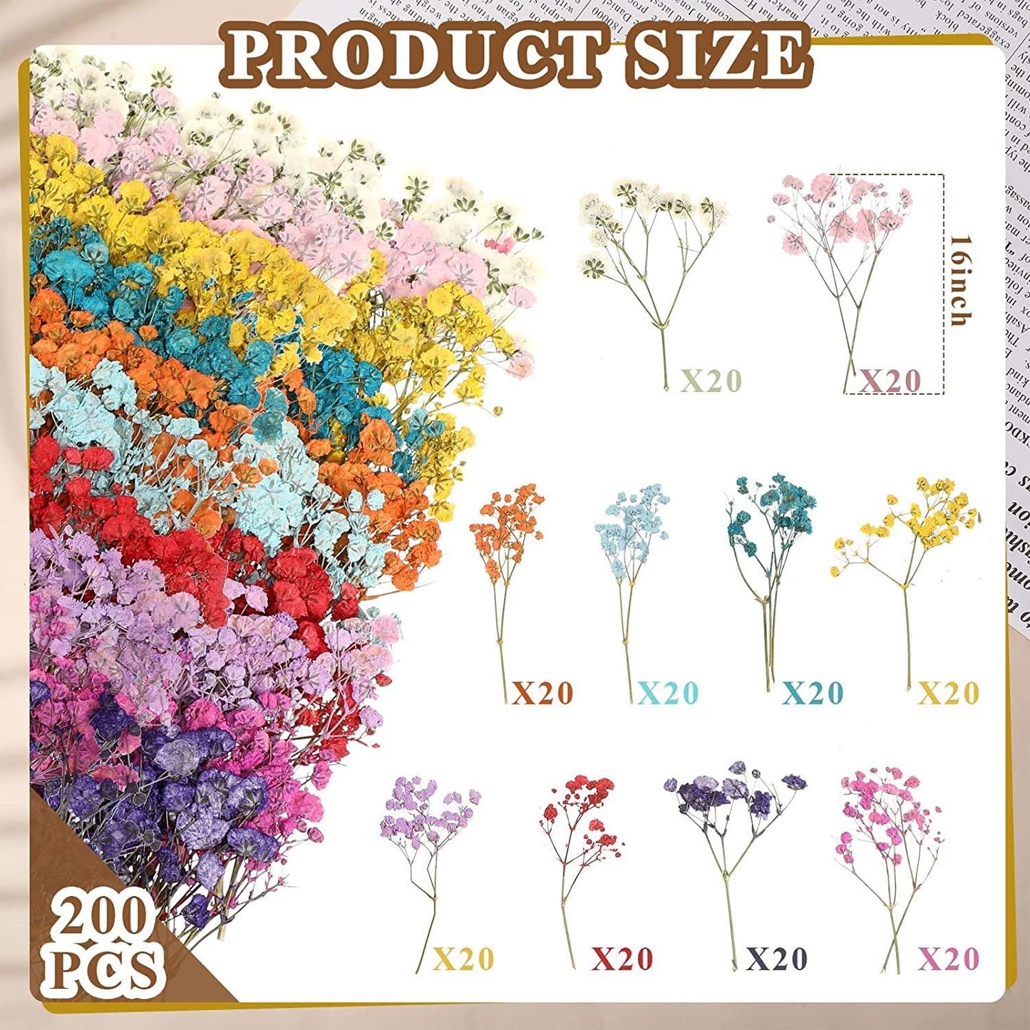 - Abundant Quantity: you will get 200 pieces of pressed dried flowers, vacuum package, 10 colors, including white, pink, yellow, blue, purple, orange, light blue, light purple, bright red, rose red, 20 pieces per color, enough quantity and mixed colors to meet your diverse use, replacement and sharing needs, embellishing your crafts and decorations