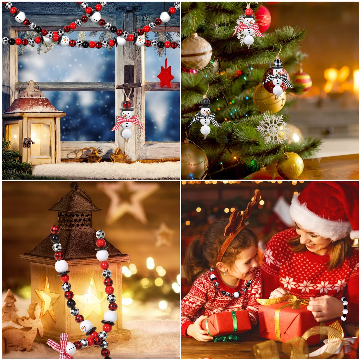 - What will you get: The Christmas wood beads package comes with snowman face wooden beads, snowman belly wooden beads, white wooden beads each of 30 pieces. Red wooden beads, black wooden beads, black white plaid beads, black red plaid beads each of 20 pieces.30 pieces of black discs, as well as 1 red and white lattice ribbon, 1 black and white lattice ribbon, and 1 bundle of rope.