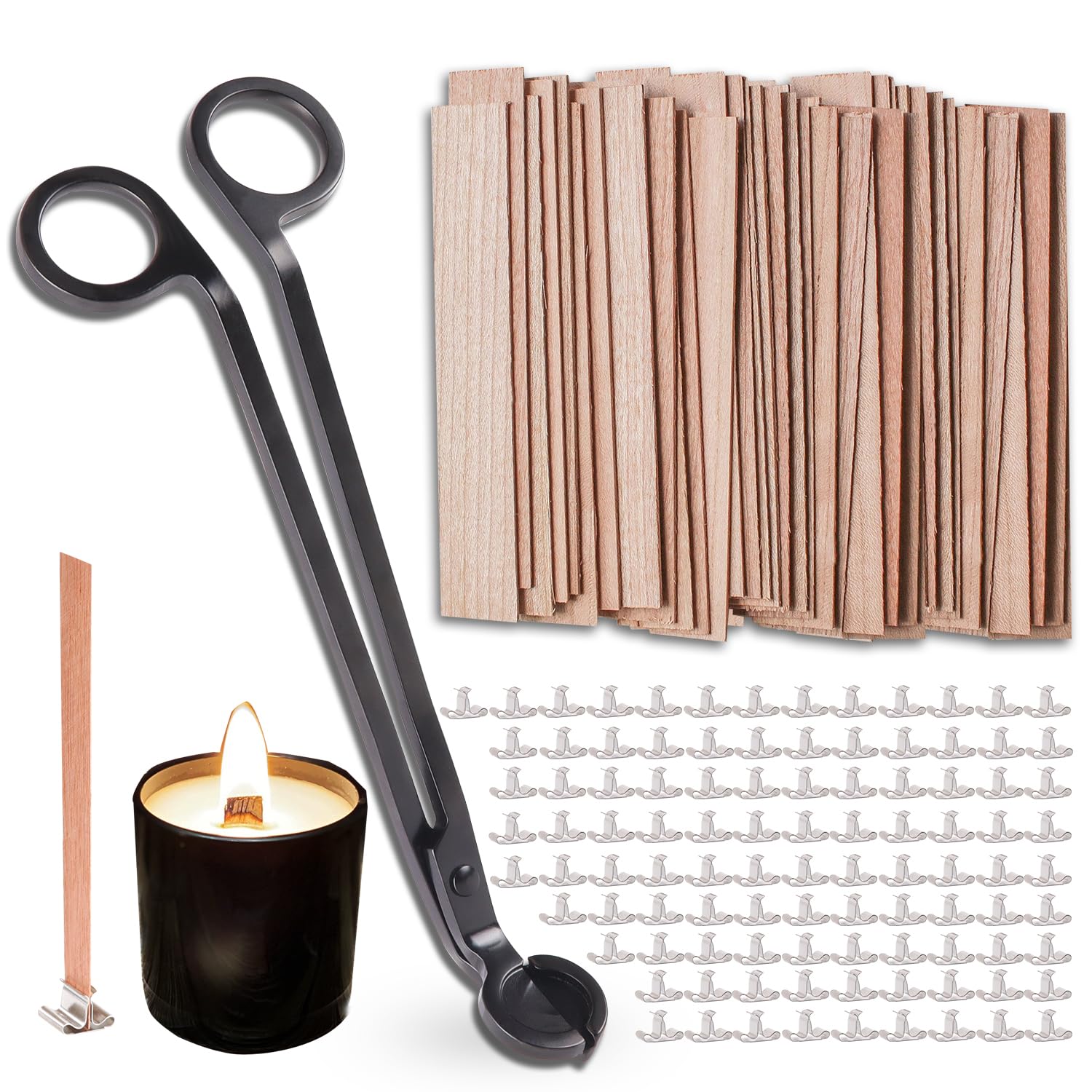 200Pcs Wooden Candle Wicks,Wood Candle Wicks Smokeless 5.1 x 0.5 Inch Natural Wood Wicks for Candles with Golden Candle Wick Trimmer and Iron Stand for DIY Candle Making (100 Set)