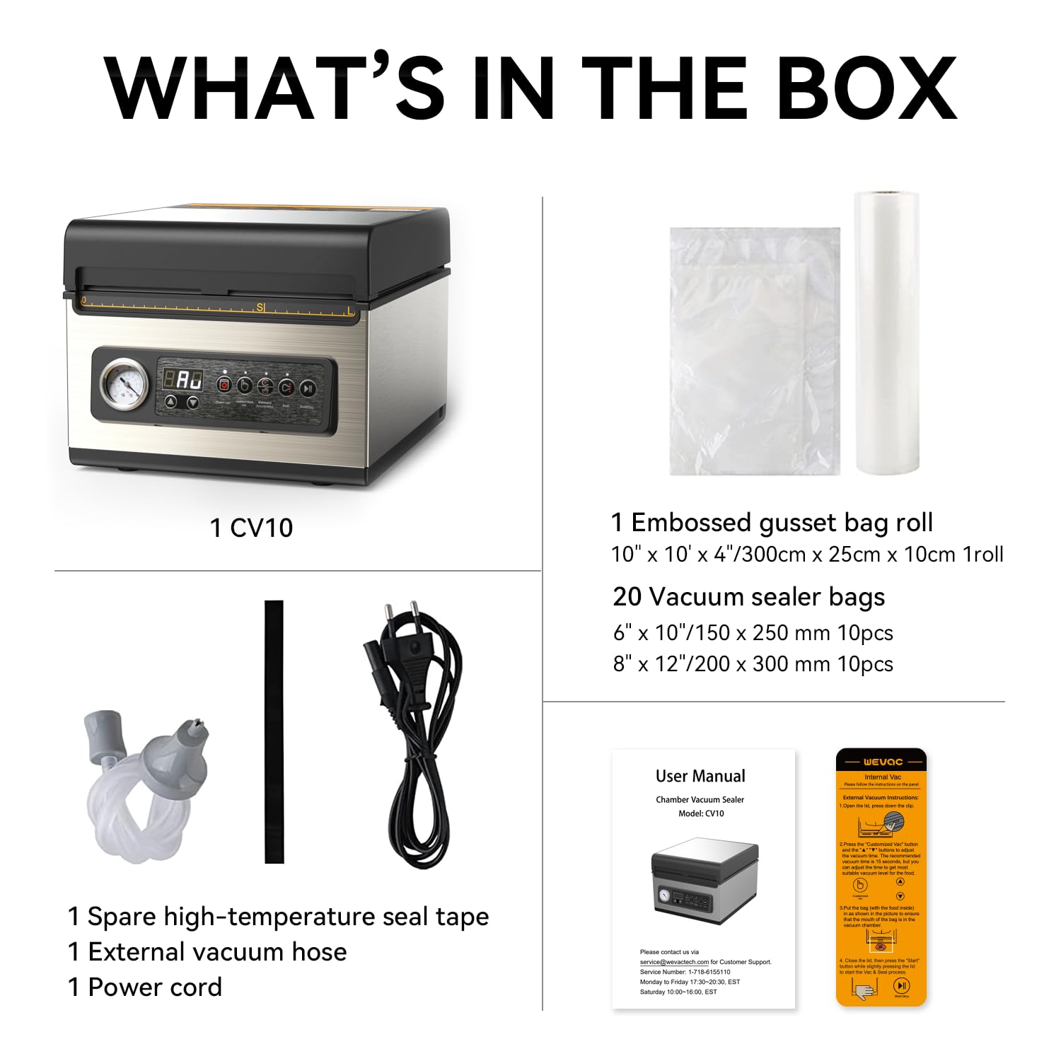 Details: [2023 New!] 10 inch Chamber Vacuum Sealer, ideal for liquid or juicy food including Fresh Meats, Soups, Sauces and Marinades. Compact design, Visible vacuum degree, Heavy duty, Professional sealing width, Commercial machine, Wevac CV10