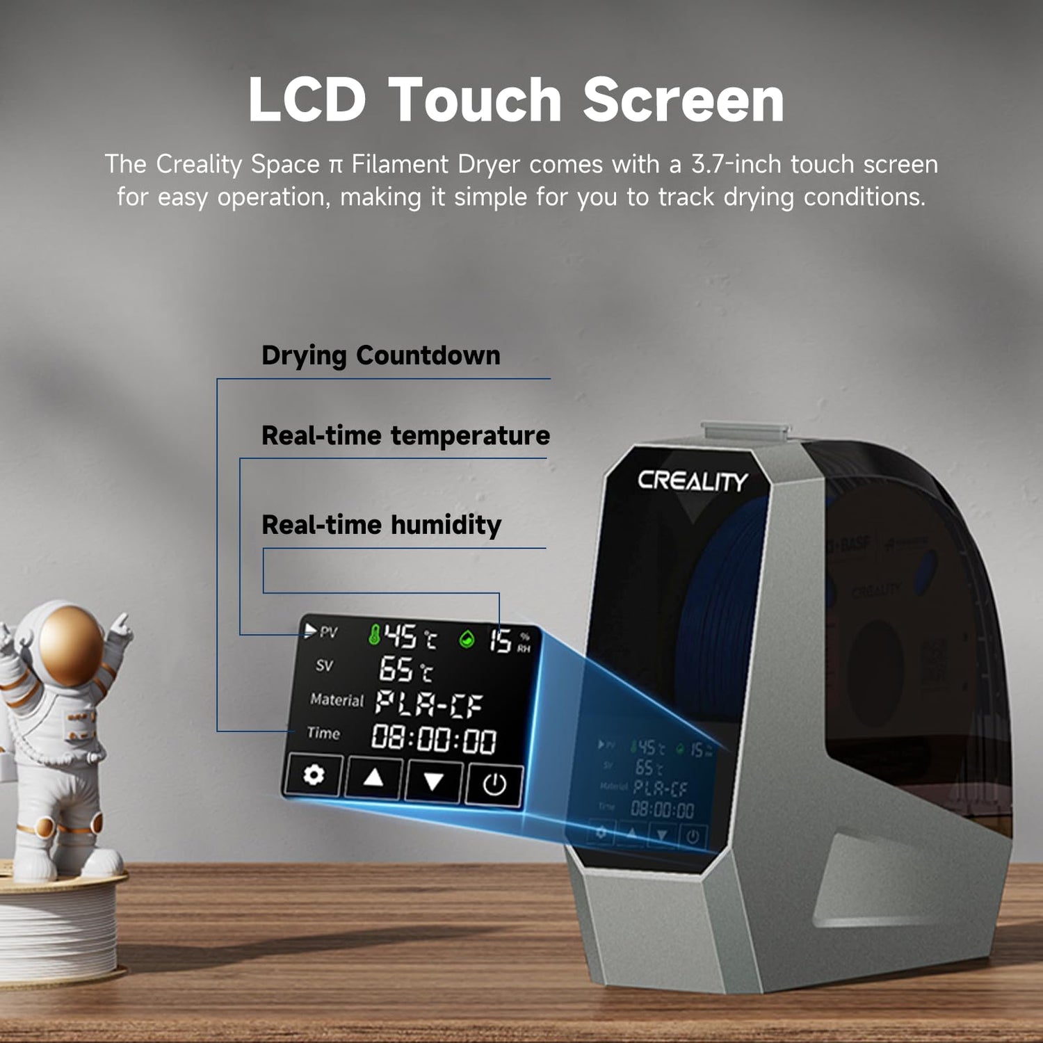 - 【Real-time humidity & temperature monitoring】Official Creality Space Pi Filament Dryer has a high-precision humidity & temperature detection sensor, which displays the humidity & temperature inside filament dry box in real time. Creality Space Pi Filament Dryer 3.7-inch touch screen changes to show the working status of the filament drying box, enabling visualisation of 3d printer filament drying process.