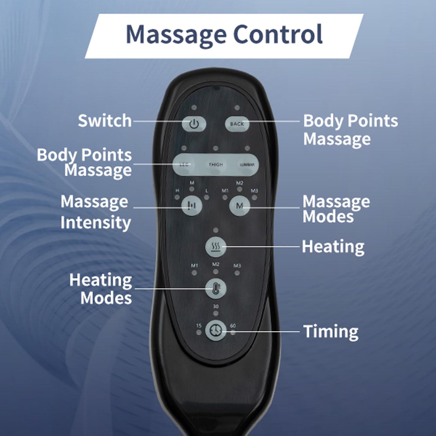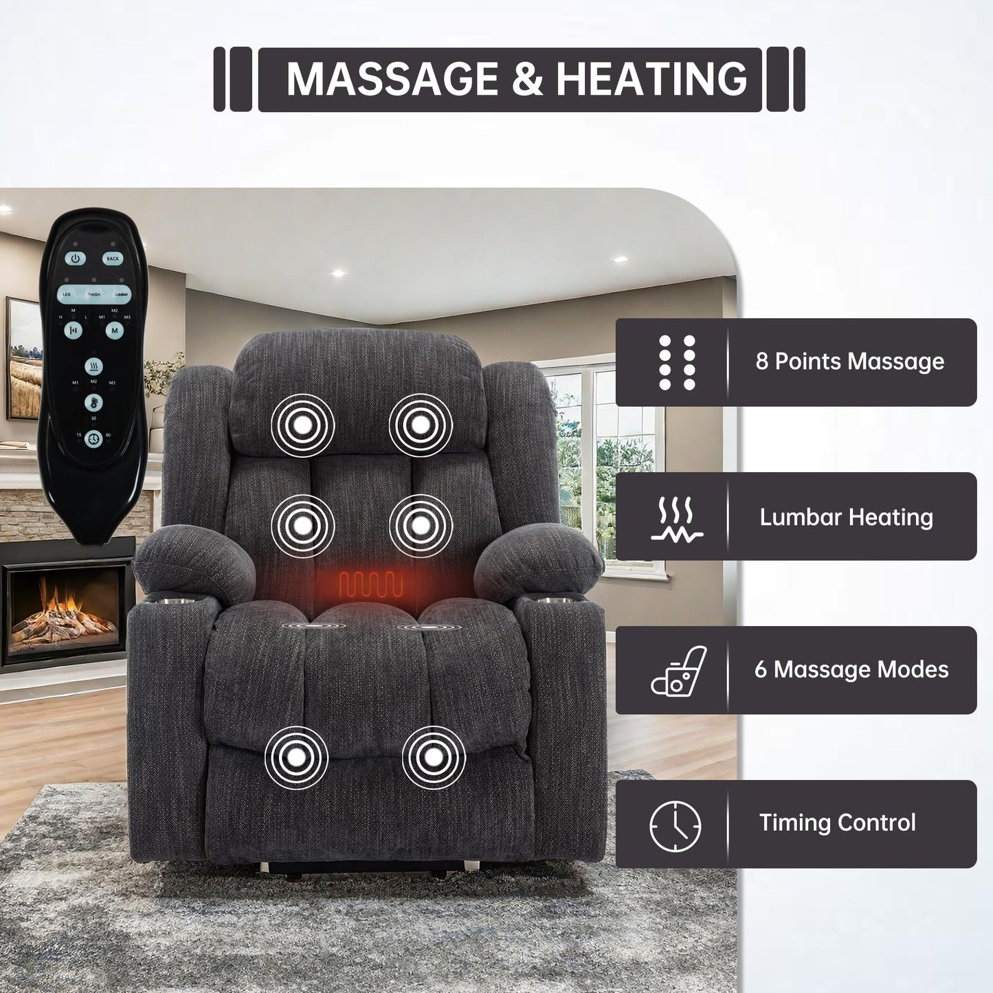 - Massage & Lumbar Heating: You can use our newly-designed hand remote control to give your back, lumbar, hips, and thighs comfortable massage service. By selecting massage intensity degrees and modes, you can select your favorite massage style to relieve tiredness, promote blood circulation, or alleviate the chronic back pain. The lumbar heating and timing functions are also included.