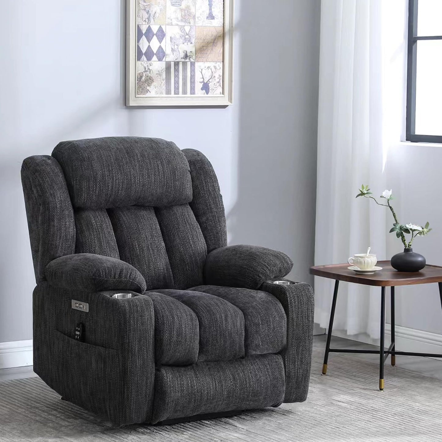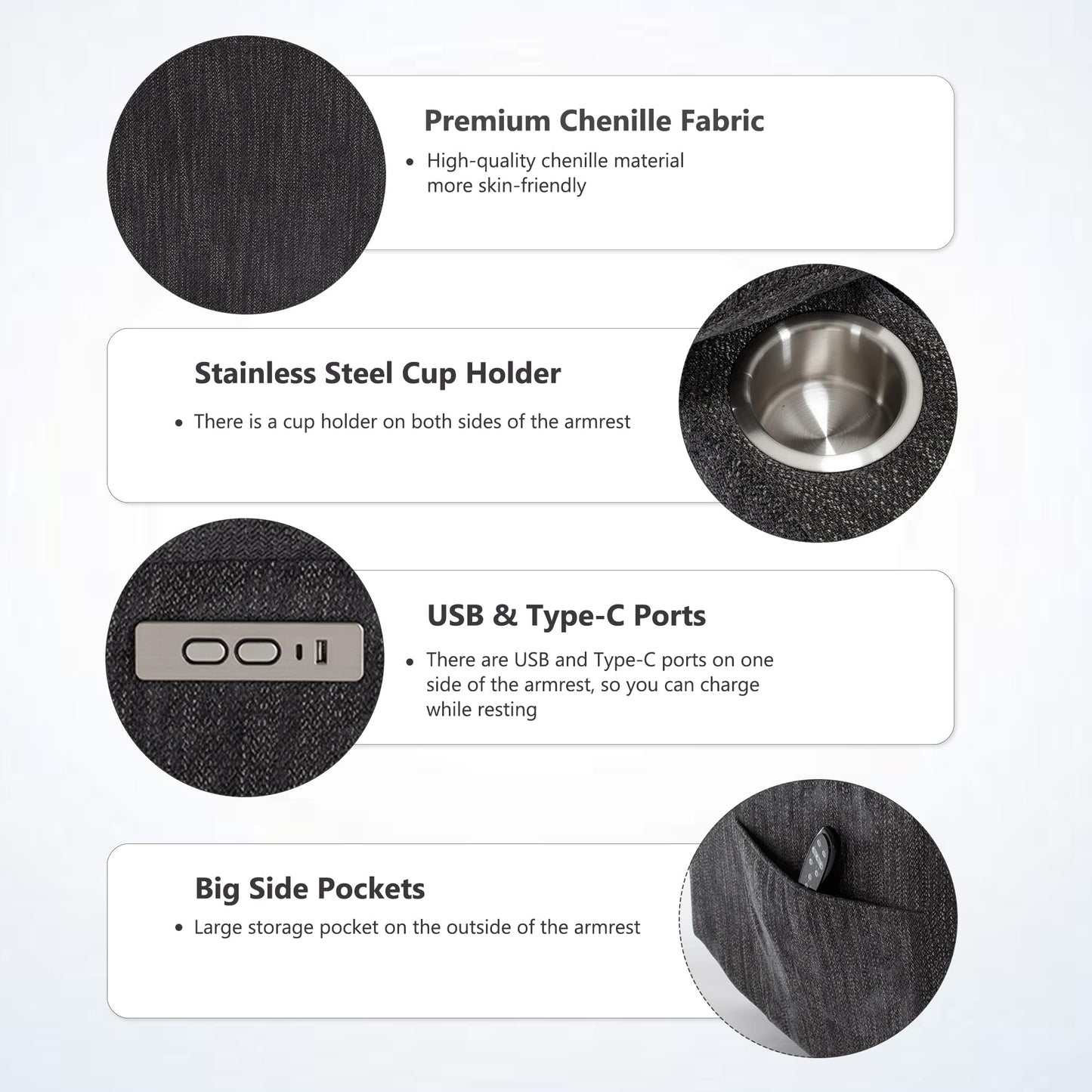 - All Convenient Accessories Equipped: Different from others’ plastic cupholders, our cupholders are made of 304 stainless steel, solid and healthy. Meanwhile, side pockets also provide great convenience for storing books, magazines, or other small things. The USB and Type-C charging ports will allow you to charge your mobile devices while enjoying a movie or reading a book. (Notes: The USB and Tape-C ports are ONLY for low-power devices, such as mobile phones and mini fans.)