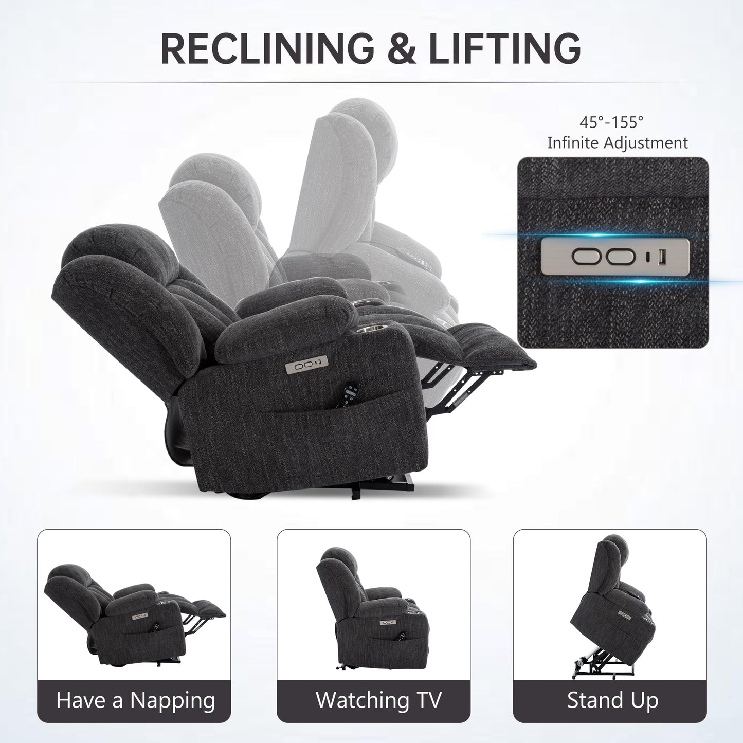 - Comfortable Power Lift Chair: The power lift recliner features soft chenille fabric, overstuffed padding and built-in springs in both the back and seat, giving your full body an unexpected sense of wrapping. And an extended footrest allows you to comfortably recline and relax on the chair.