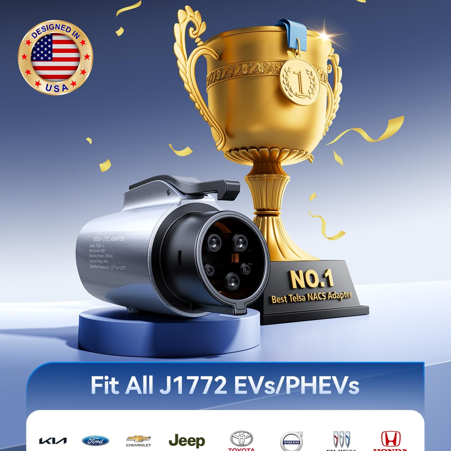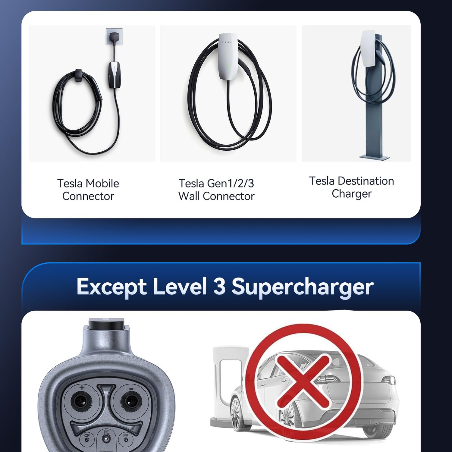 - EASY TO INSTALL, PLUG-AND-PLAY: Without intricate setups, effortlessly charge your J1772 EVs at any Tesla station(Except Level 3 Tesla SuperCharger). Just plug in and power up, making it the perfect travel companion for hassle-free charging on the go. Compact and lightweight tesla to J1772 charger converter comes with a convenient carrying bag means it easily fits in your J1772 EVs storage areas. Ensuring it’s always there when you need it, without taking up valuable tesla space.