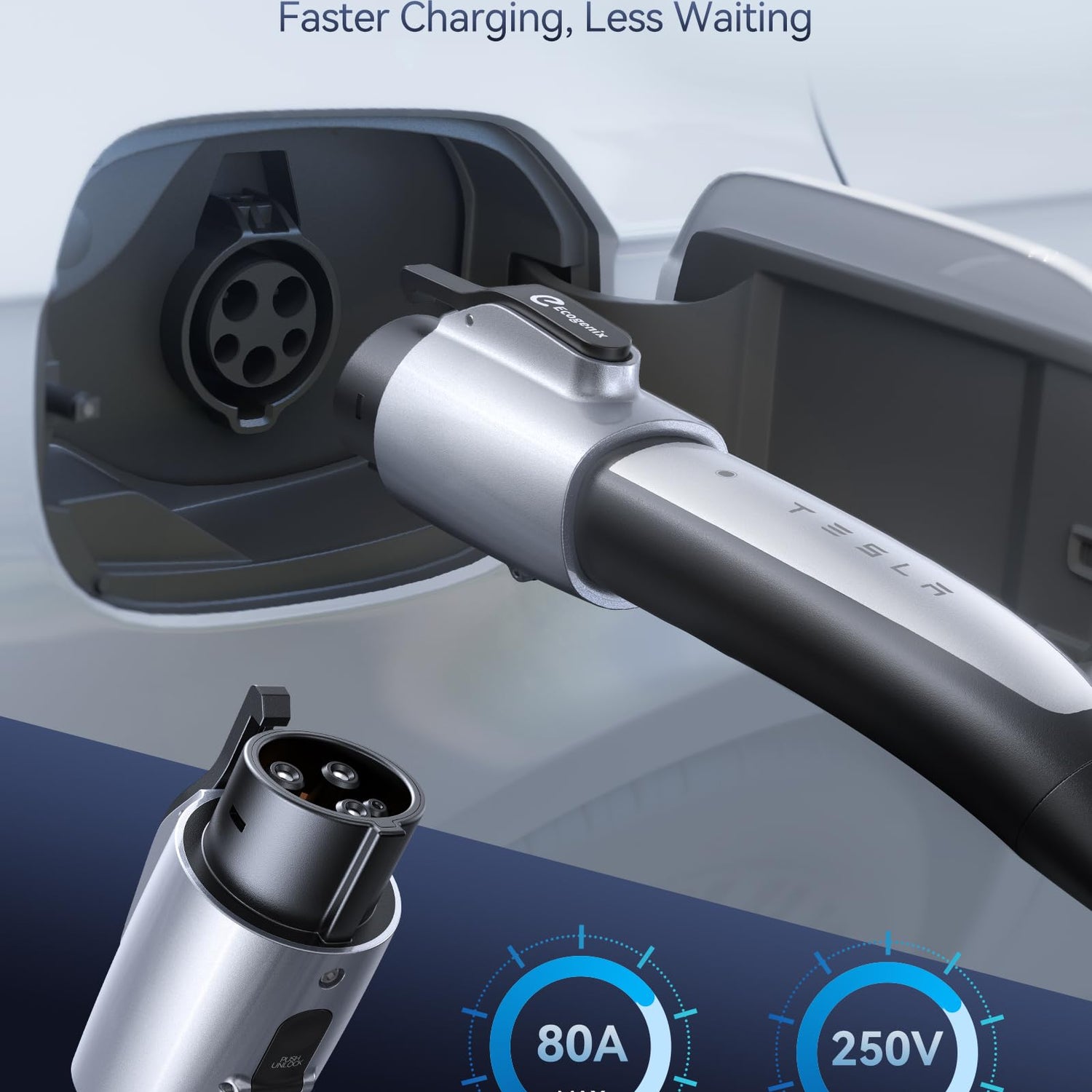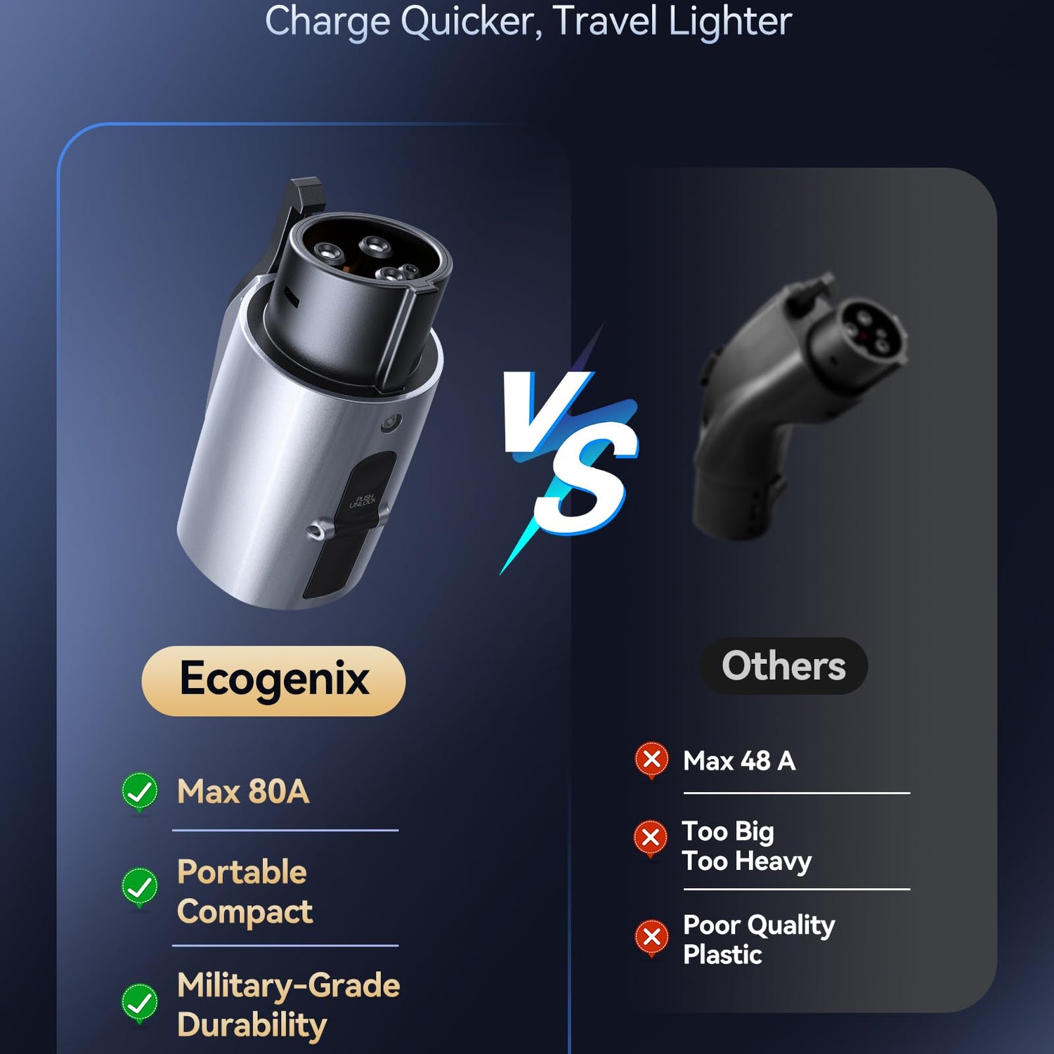 - FASTER AND SAFER CHARGING: The Ecogenix J1772 adapter supports max 80A output current and 250V AC input voltage. It's backward compatible with 60A, 48A, 40A or 32A tesla charger, can meet your ultra-fast charging needs. With ultra-high current load capacity, it enables fast and efficient charging for your J1772 EVs. Make the most of your travel time with an adapter that supports your lifestyle and keeps you moving forward.