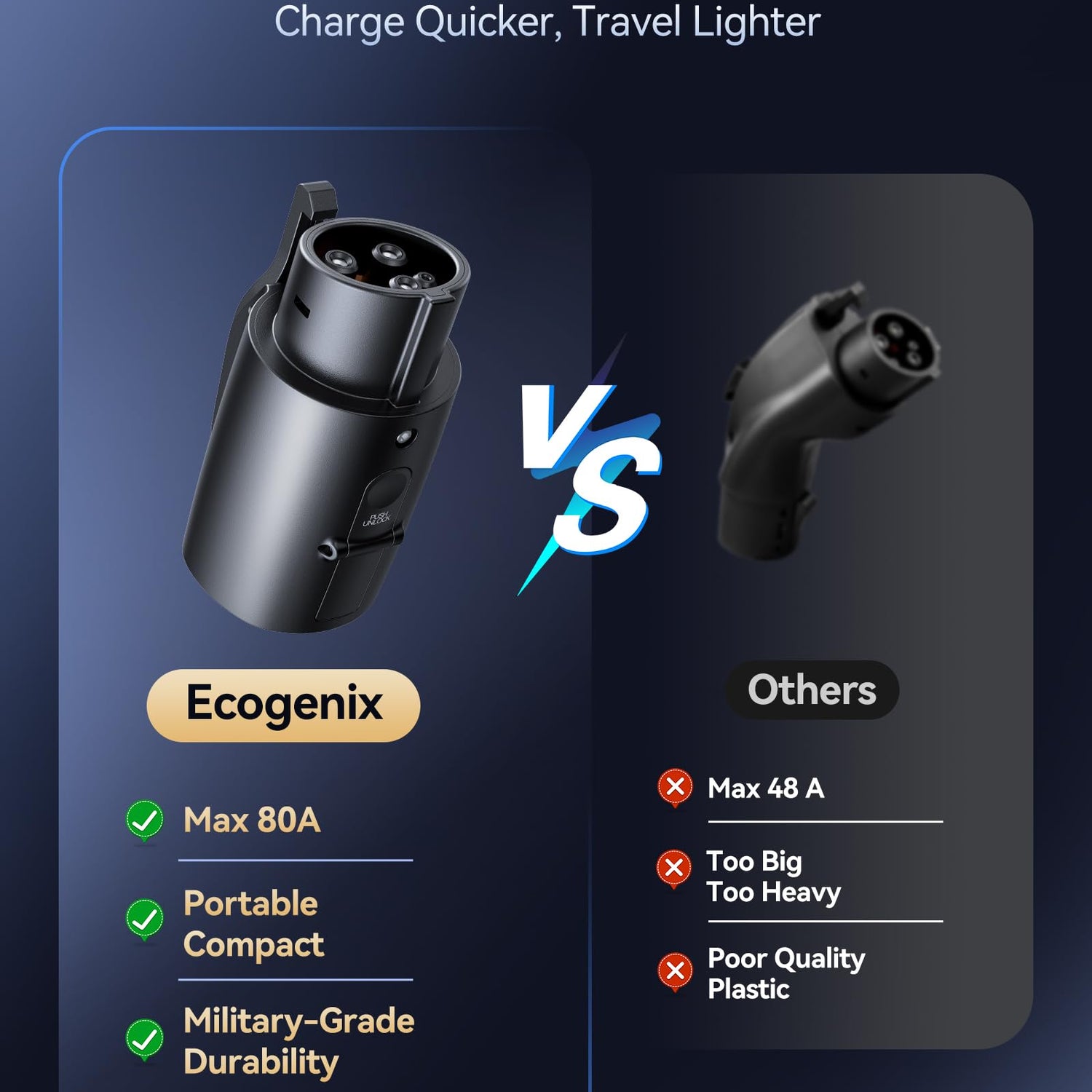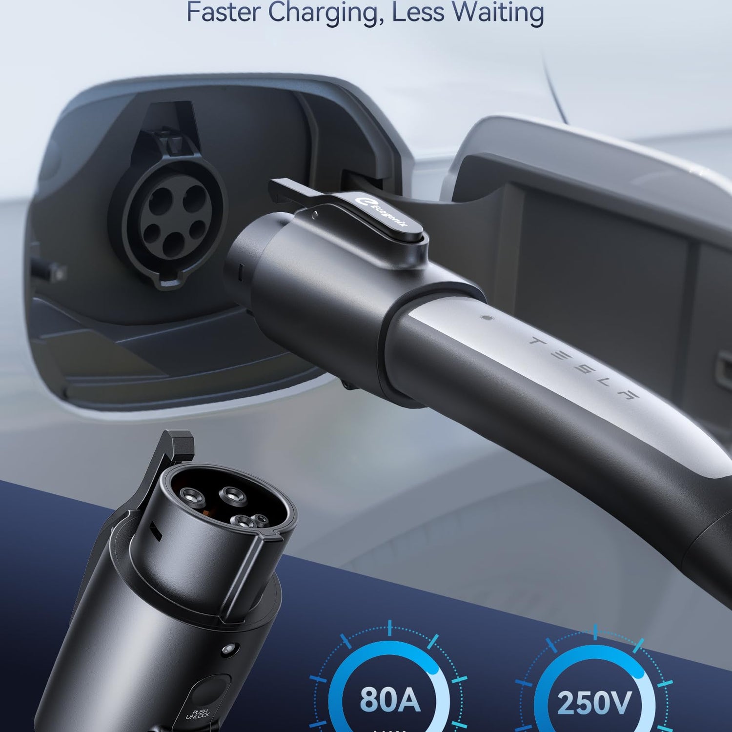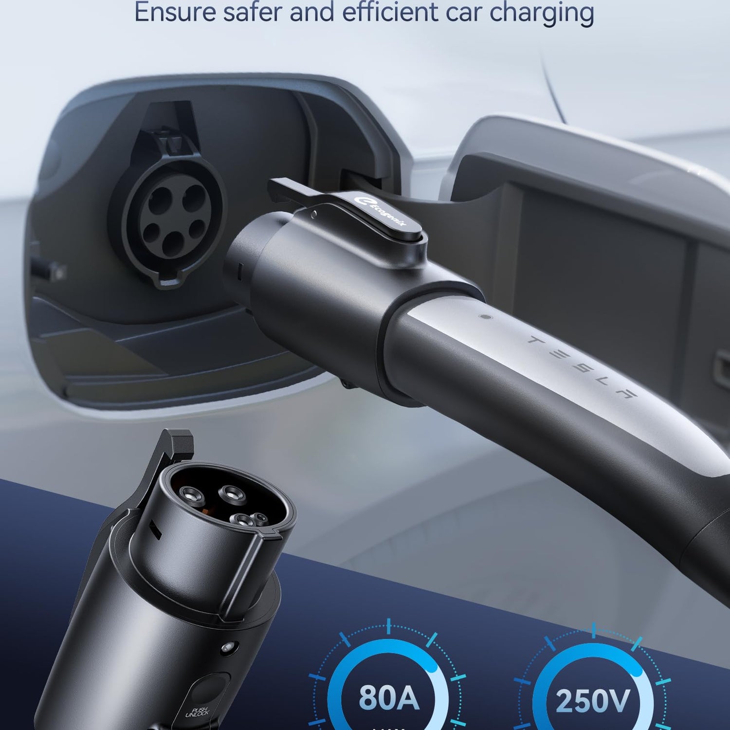 - FASTER AND SAFER CHARGING: The Ecogenix J1772 adapter supports max 80A output current and 250V AC input voltage. It's backward compatible with 60A, 48A, 40A or 32A tesla charger, can meet your ultra-fast charging needs. With ultra-high current load capacity, it enables fast and efficient charging for your J1772 EVs. Make the most of your travel time with an adapter that supports your lifestyle and keeps you moving forward.