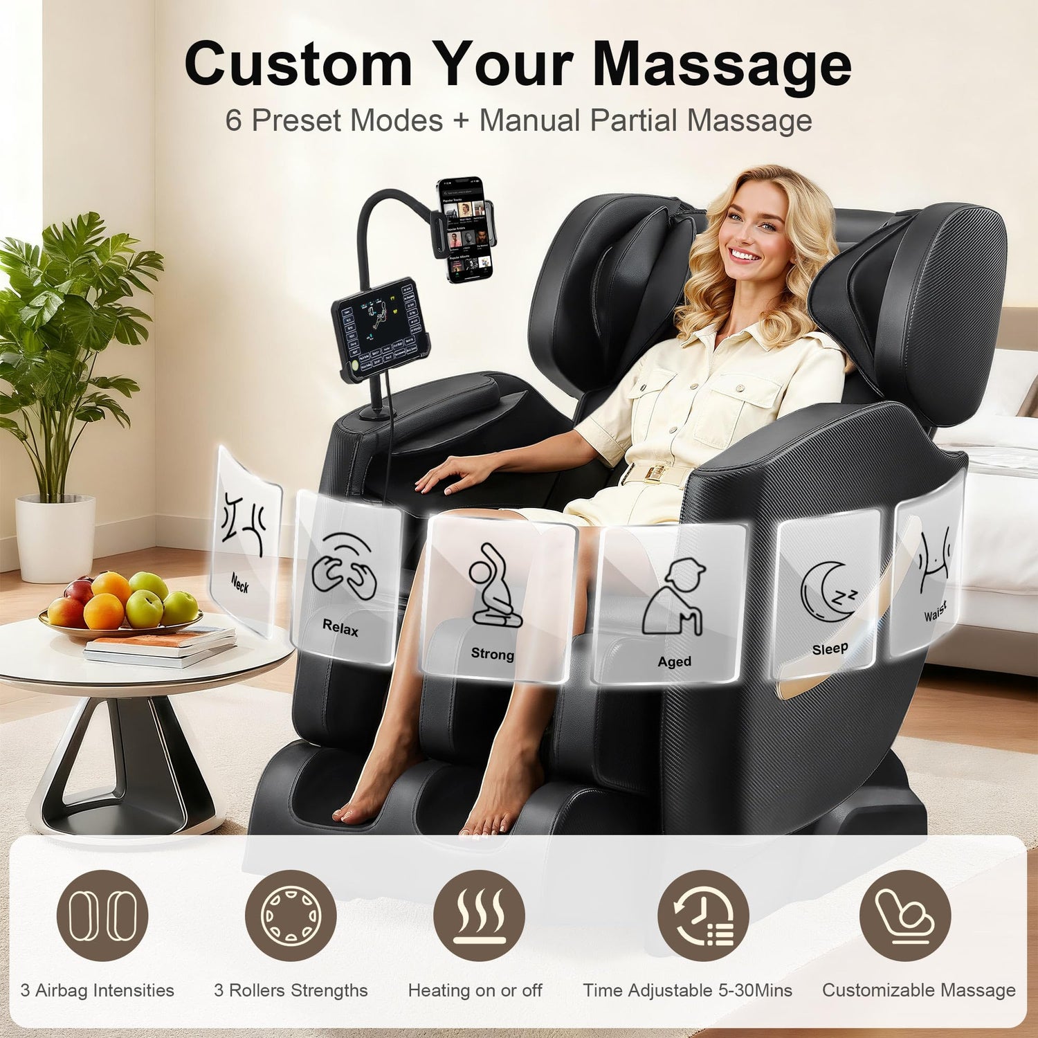 - ✅【Smart Control + More Practical Design】 Effortless 7in touchscreen controller - easy to operate even for seniors and first-time users. Bluetooth speaker lets you enjoy your favourite music while massaging. Longer 7.5" retractable footrest for various height, ambient light + 360° phone stand + wheels for easy moving around, luxury appearance suitable for all bedroom and living room