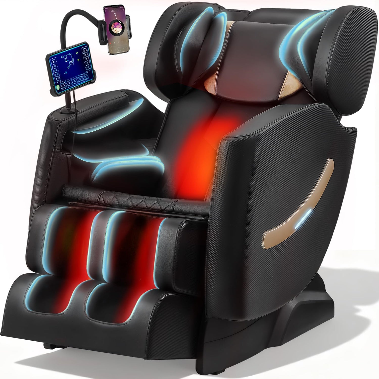 - ✅【Smart Control + More Practical Design】 Effortless 7in touchscreen controller - easy to operate even for seniors and first-time users. Bluetooth speaker lets you enjoy your favourite music while massaging. Longer 7.5" retractable footrest for various height, ambient light + 360° phone stand + wheels for easy moving around, luxury appearance suitable for all bedroom and living room