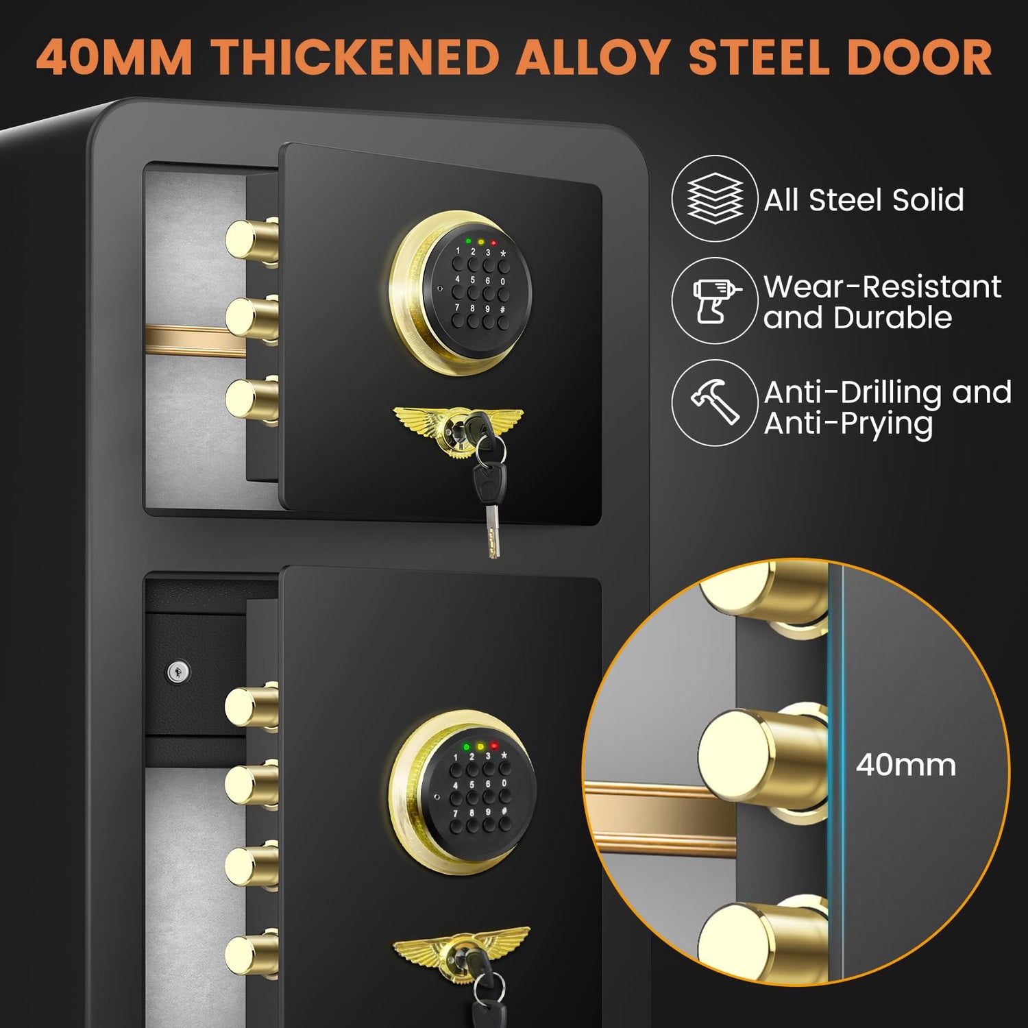 - 78 LBS HEAVY DUTY ANTI-THEFT HOME SAFE: 78mm super thick and explosion-proof steel door, 7*25mm high strength solid core lock bolts and tamper-proof hidden hinges, providing reliable protection for your valuables and pistols. Our safe weighs up to 78 pounds, so it's hard for anyone to steal it, or if you want MORE SECURITY, it can be bolted to the wall or the floor to further prevent the risk of theft