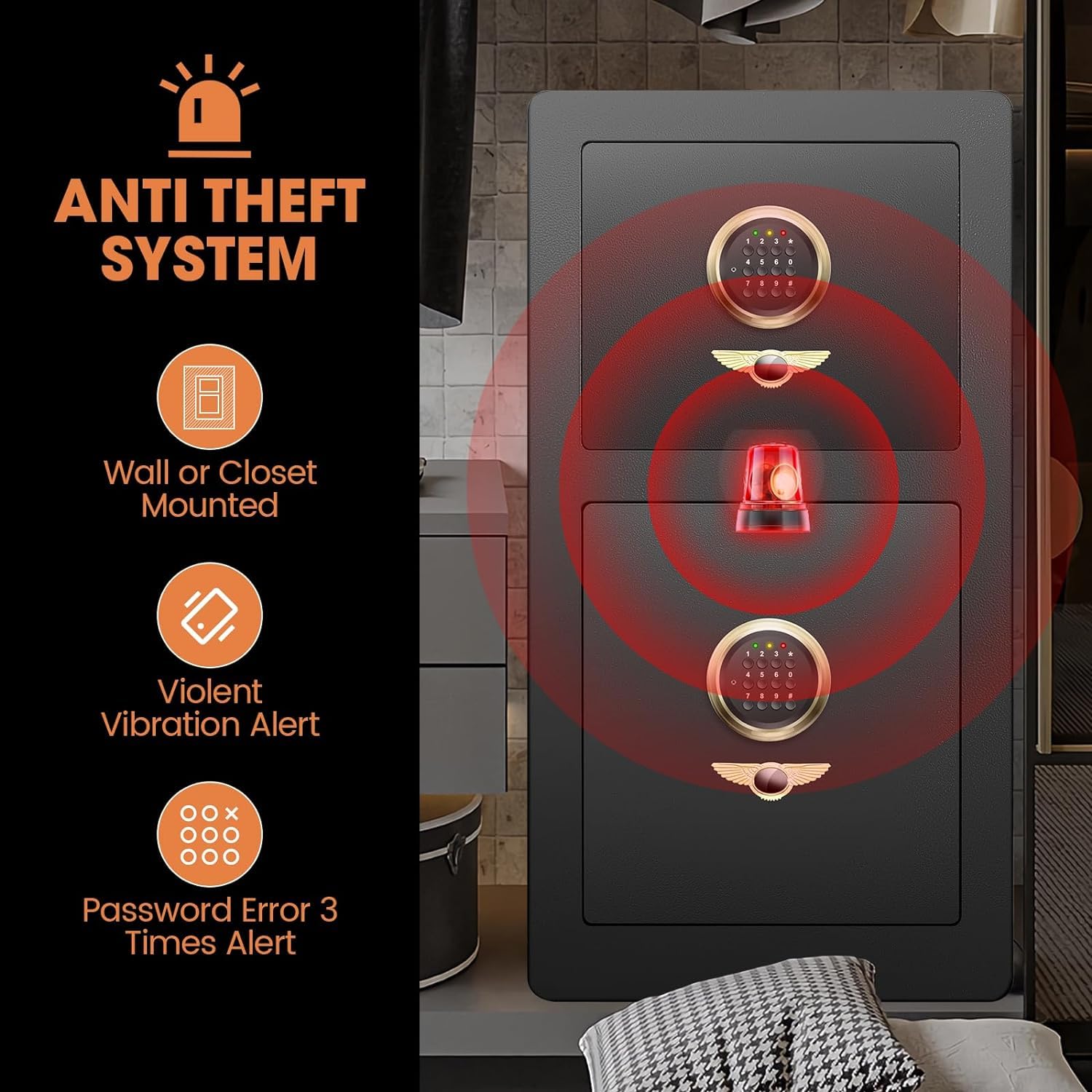 - DUAL ANTI-THEFT ALARM SYSTEM: All illegal access is denied! 1.Password error alarm: Enter the wrong password 3 times, the system will lock and alarm for 60 seconds. 2.Vibration alarm: If someone tries to move it while it is locked, the alarm will also sound. It can effectively deter unauthorized access and secures valuables away from kids