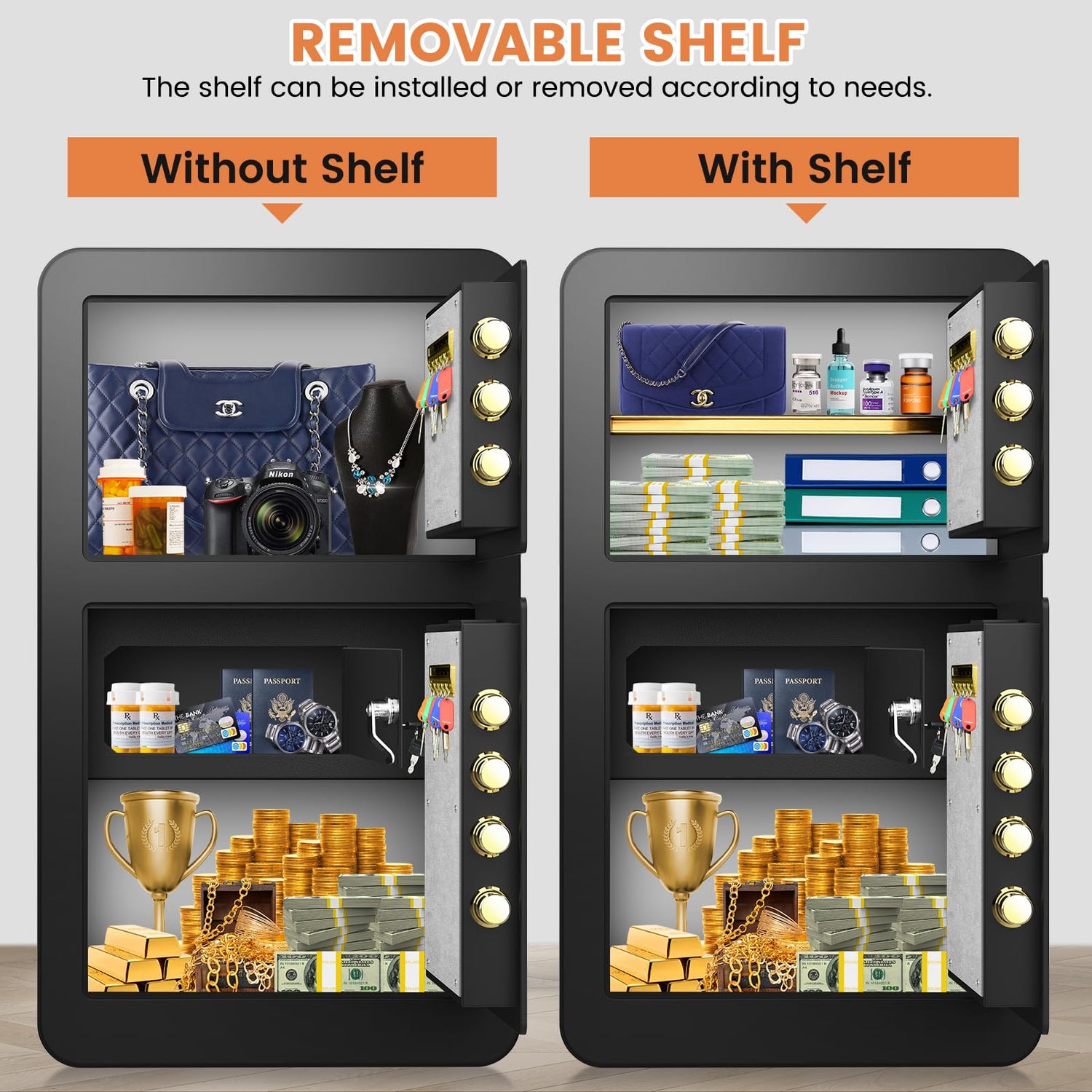 - REMOVABLE SHELF & HIDDEN STEEL LOCK BOX: The inside of the home safe is covered with thick felt to prevent valuables from being worn. The removable shelf can easily adjust different storage space according to needs. It also comes with a hidden steel lock box to further protect your privacy