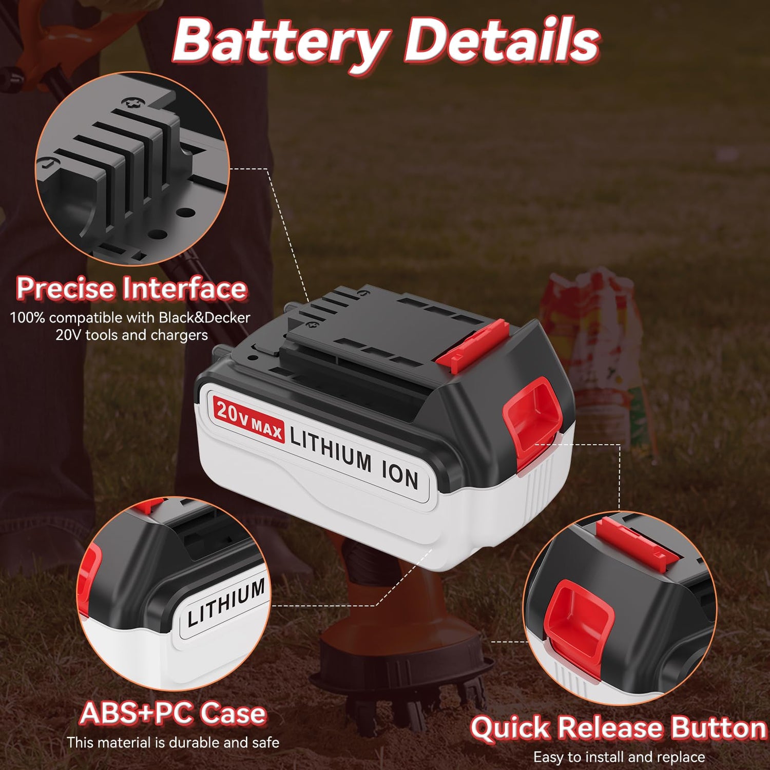 - High Capacity: This lithium-ion battery replacement for Black and Decker 20v battery with 6000mAh higher capacity; High-rate power cells provide more powerful power to your tools and make your work more efficient.