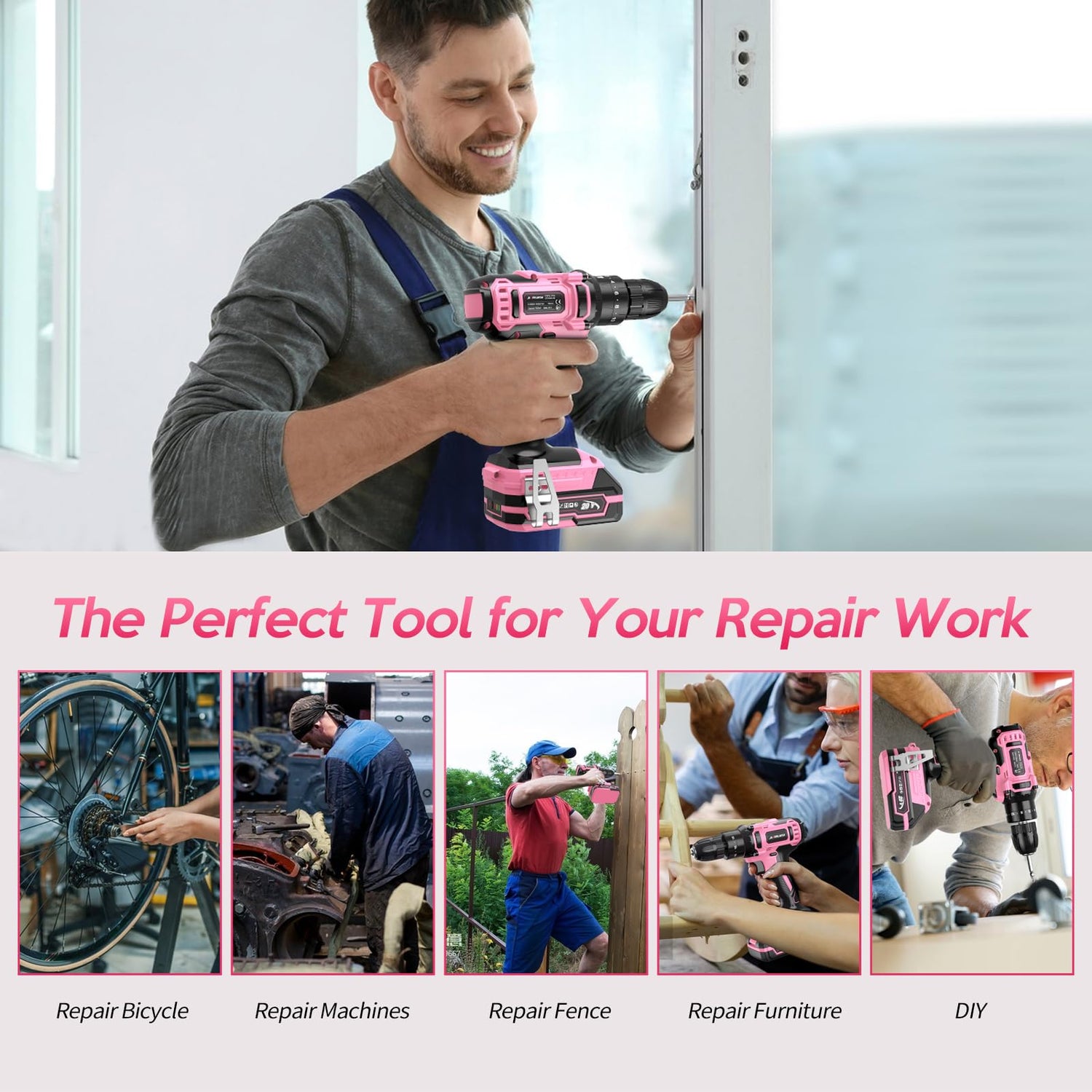 20V Cordless Drill, Electric Power Drill Set with Battery Charger, 3/8” Keyless Chuck, 2 Variable Speed, 18+3 Torque, 72pcs Driver Bits and Belt Hook, Pink