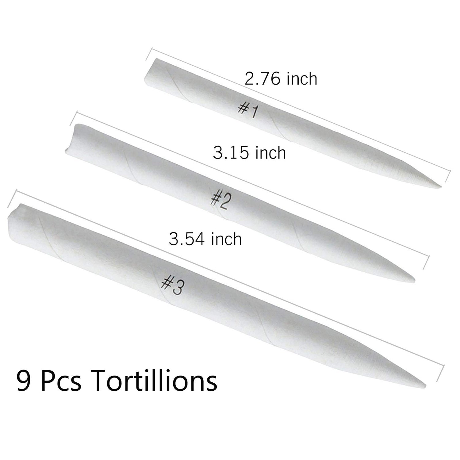 - DIFFERENT SIZES - Blending stumps set assorted size: #1, #2, #3, #4, #5, #6, #7, #8, each size 1 pc; Tortillion set size: #1, #2, #3, each size 3 pcs;This charcoal blending stumps and tortillion set can be sharpened by sandpaper blocks.Use them for blending pencil, pastels, and charcoal. Keep the stumps pointed by sharpening them with a sanding block