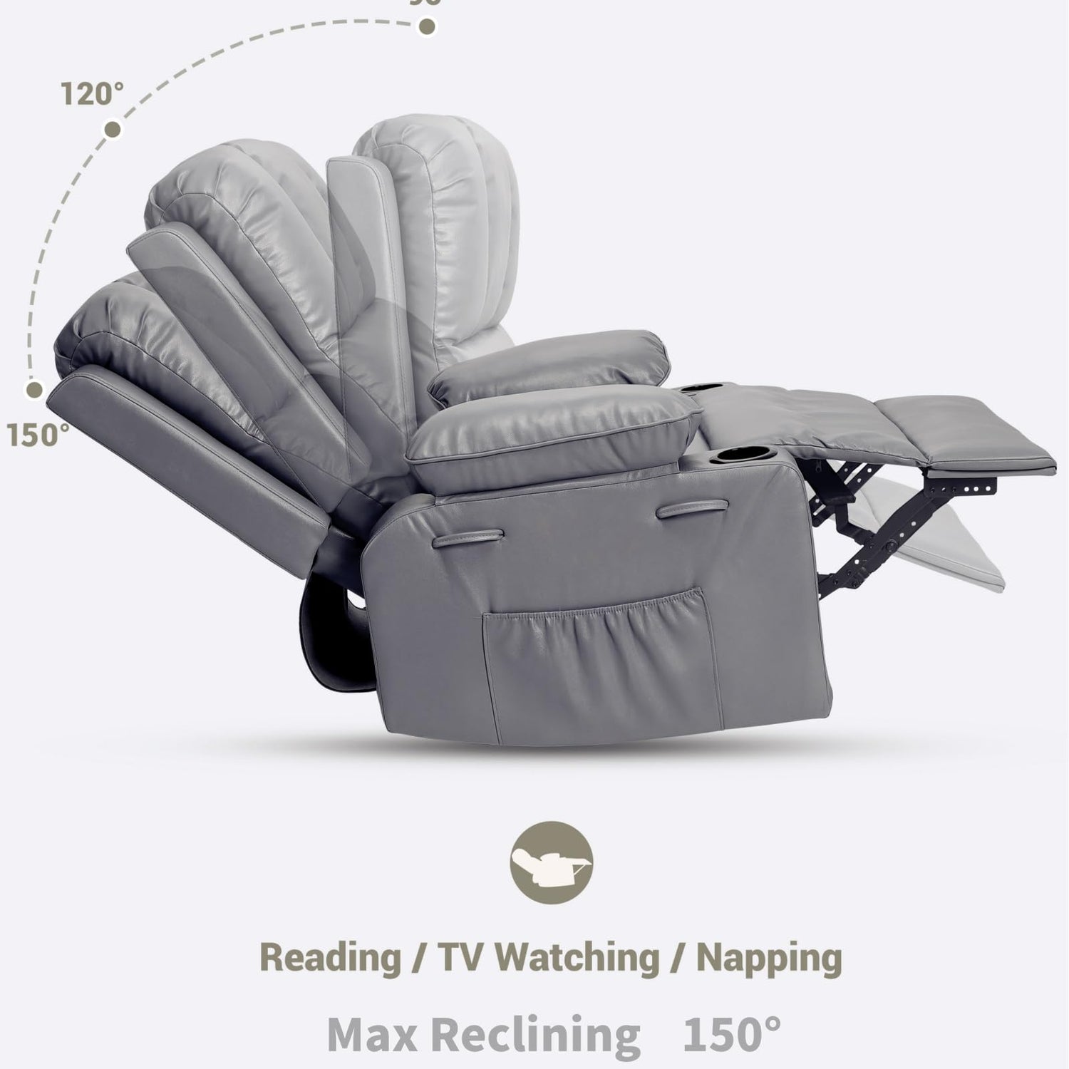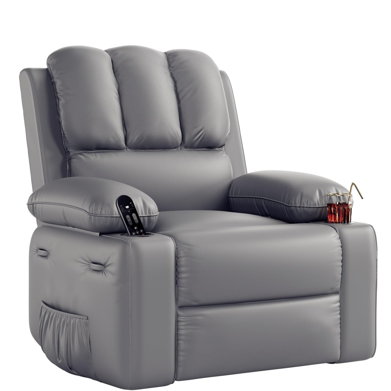 22 in Leather Recliner Chair for Adults, Overstuffed Manual Recliner Chair, Single Sofa with Cup Holder and Side Pockets, Upholstered Chair for Living Rooms, Gray