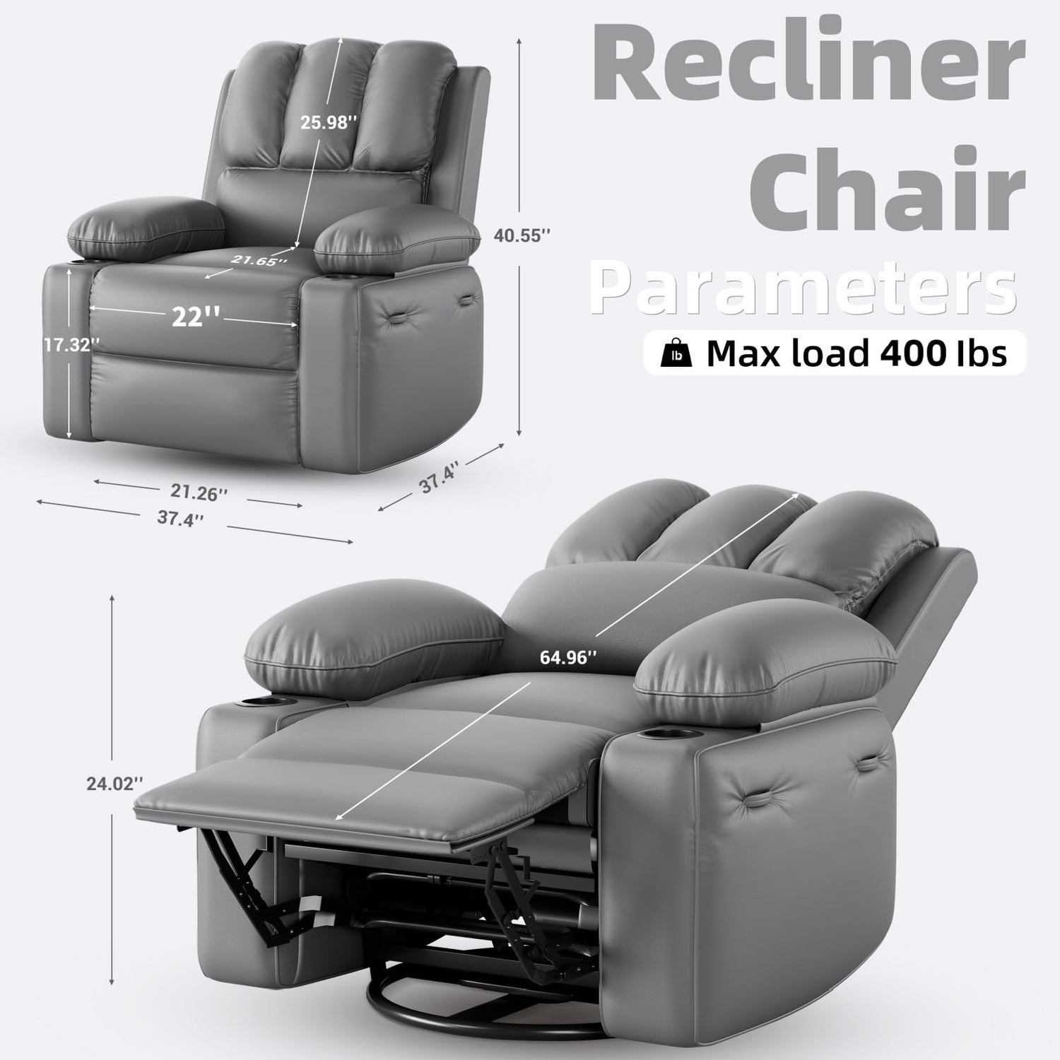 - [Size] This recliner boasts a spacious seat 22 in wide; Reclines to 150°, supports up to 400 LBS, Fits big guys better (up to 6 ft 8 in )
