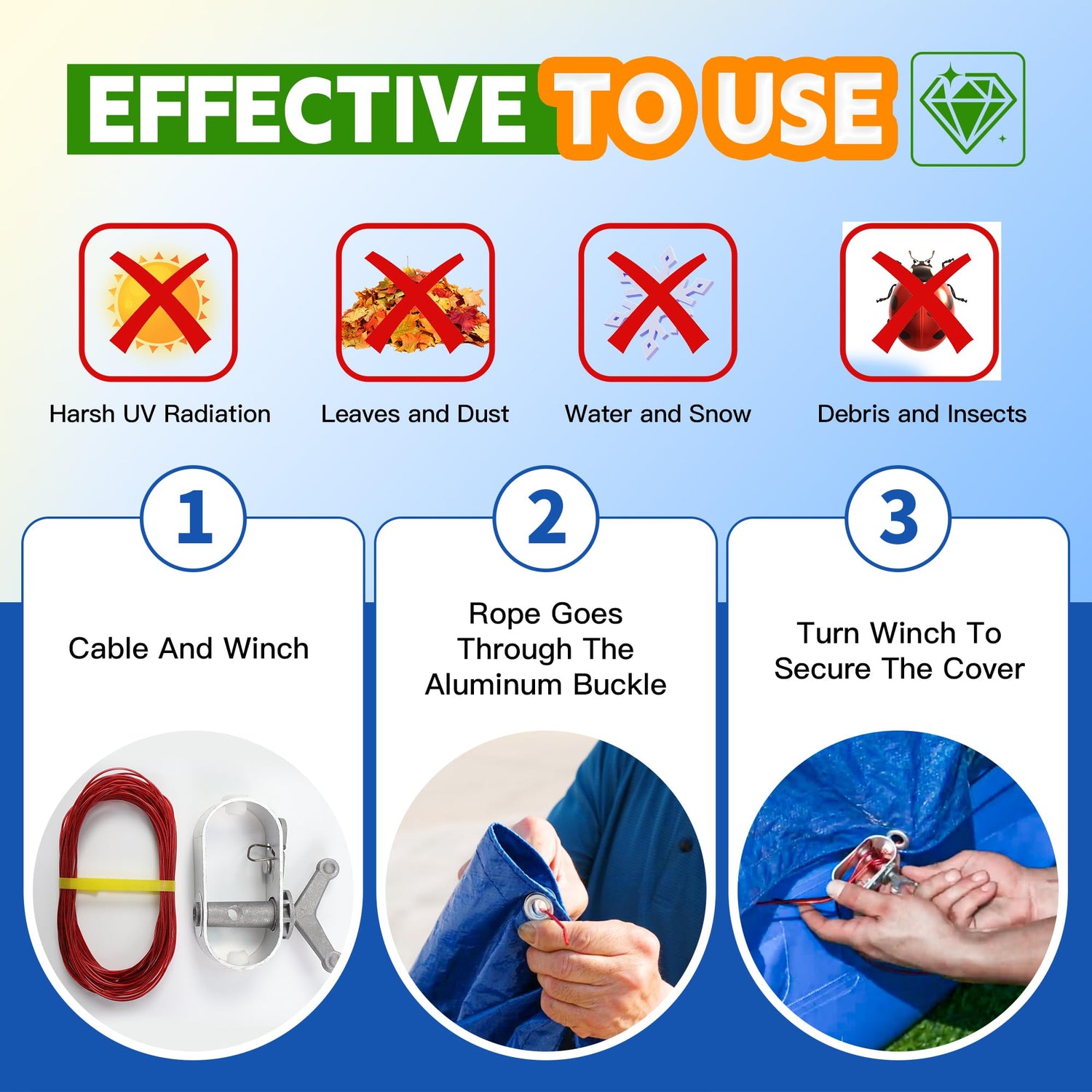 - 【4 FOOT OVERLAP】Includes 4 Feet Of Extra Material Beyond Winter Pool Cover, Making This Cover Easier To Install, Included In Cover Size Above,More Protection For Your Pool. (Includes Winch And Cable, Which Should Be Used To Secure The Cover Through The Grommets.)