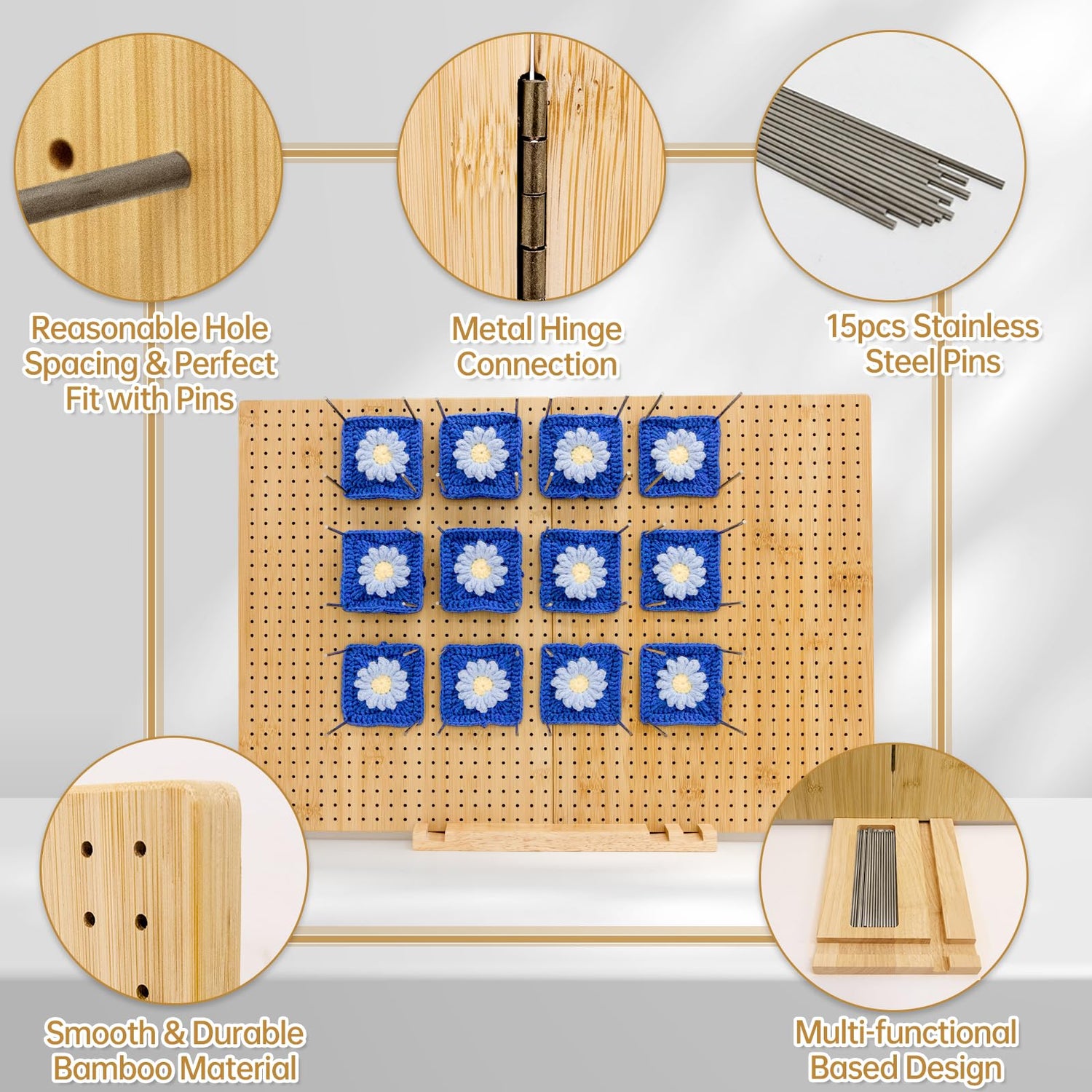 - This versatile wooden base for a granny square blocking board is truly multifunctional. Firstly, it accommodates various usage scenarios, whether folded or unfolded. Additionally, the base includes storage for steel pins, keeping your workbench organized. Moreover, the outer card slot design enables you to conveniently place your phone, pad, or knitting reference book while working, functioning as a handy stand.