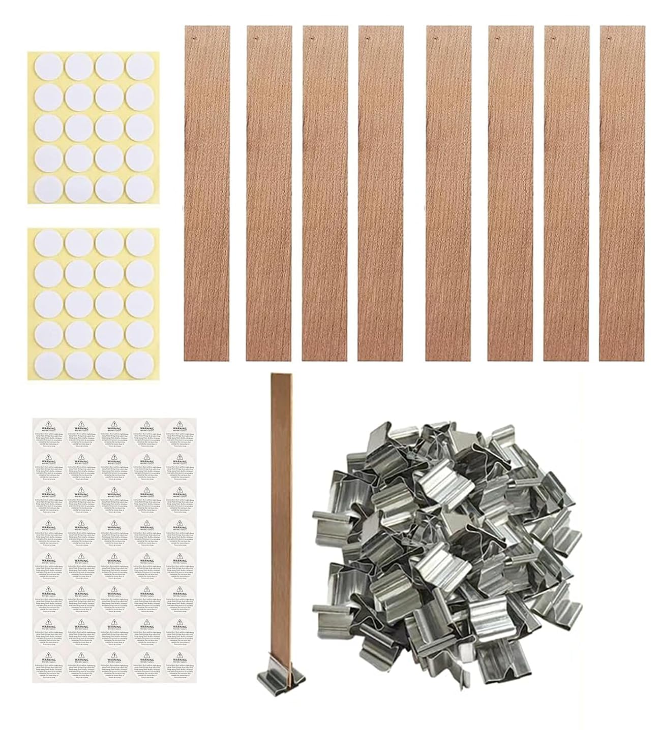 - 【230 pcs candle making wicks kit 】100 pcs wooden wicks for candle making with 50 pcs metal base, wicks are 13x1.3cm (5.1 x 0.5inch) , 0.5mm thick, 40 pcs wick sticker and 40 pcs warning safe stickers