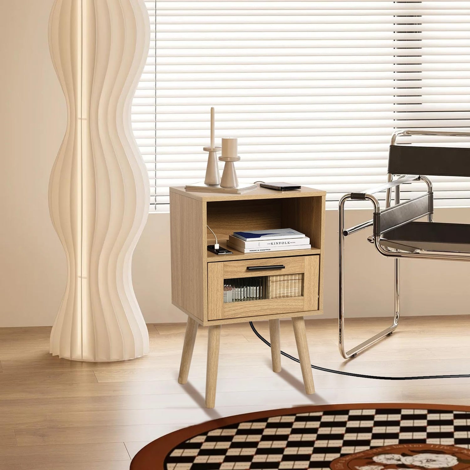 23inch Nightstand with Charging Station,2 AC outlets and 2 USB Ports, Mid Century Modern Nightstand, Bedside Tables for Bedroom, Natural Wood Side Table with Storage Drawer(Wood-1PCS)