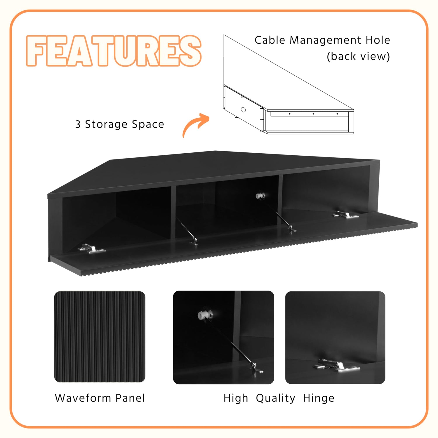 - ✨MODERN DESIGN: With its distinctive trapezoidal design and 3D wavy panel door, floating TV stand offers a sleek look and practical storage with three shelves inside the door, keeping your items organized.