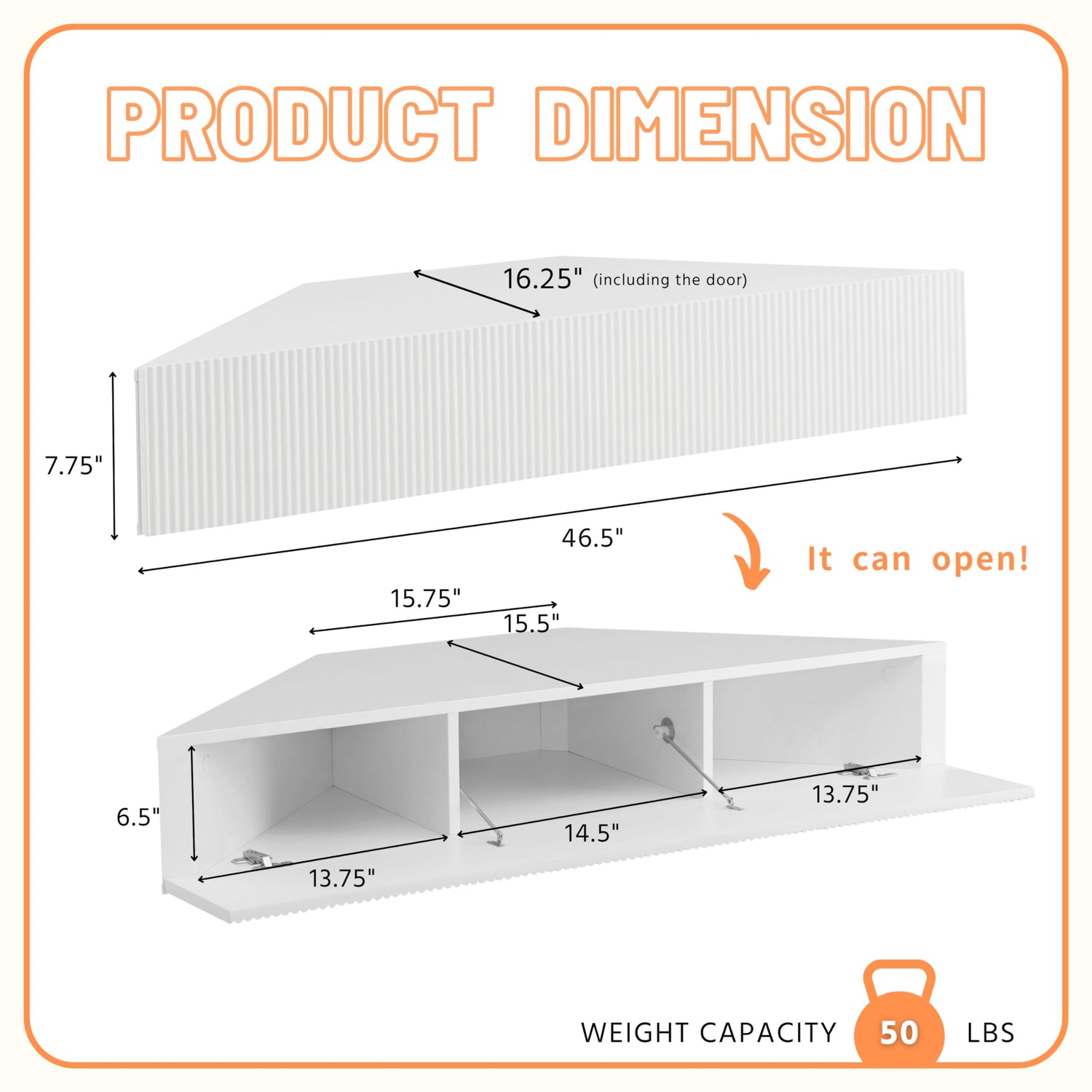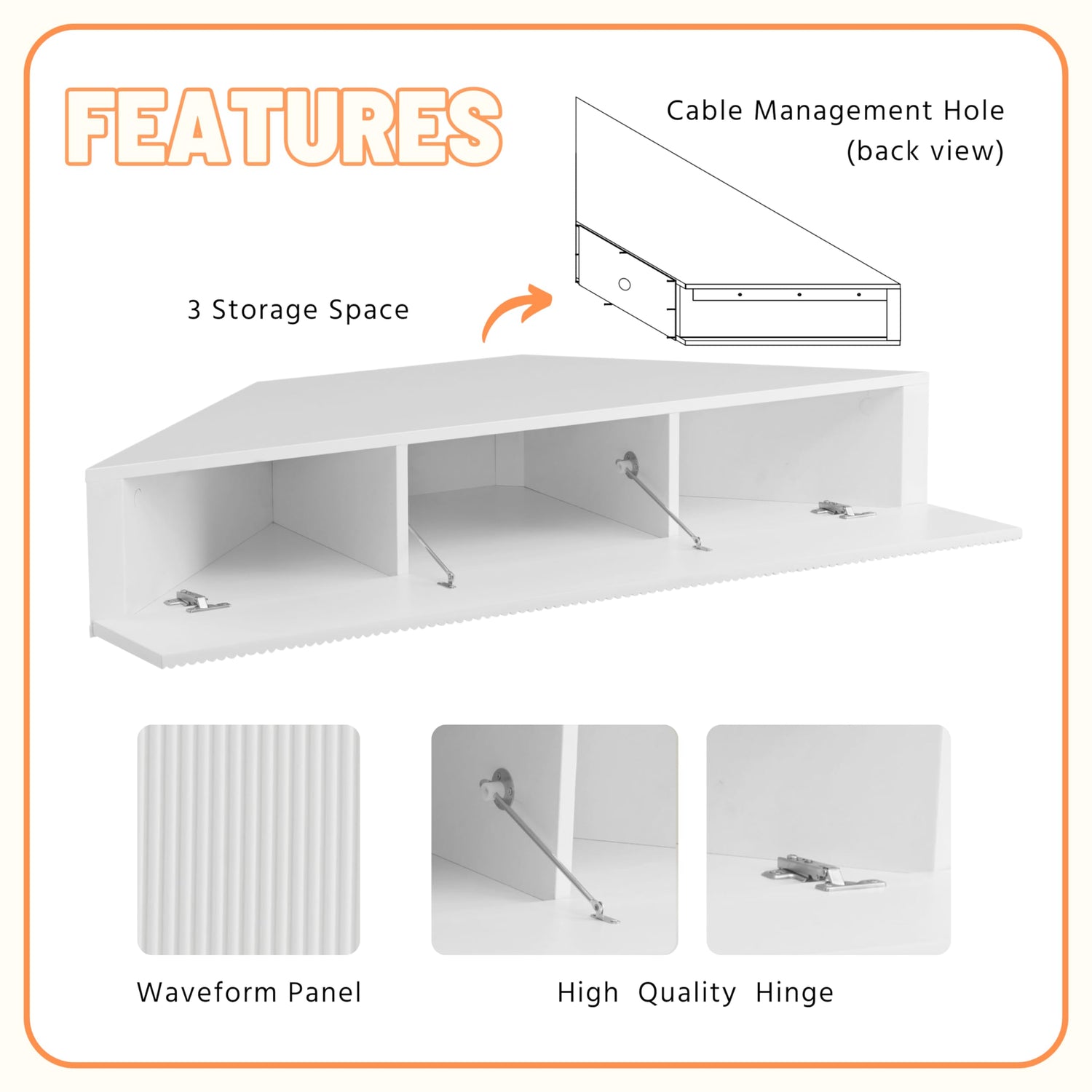- ✨MODERN DESIGN: With its distinctive trapezoidal design and 3D wavy panel door, floating TV stand offers a sleek look and practical storage with three shelves inside the door, keeping your items organized.