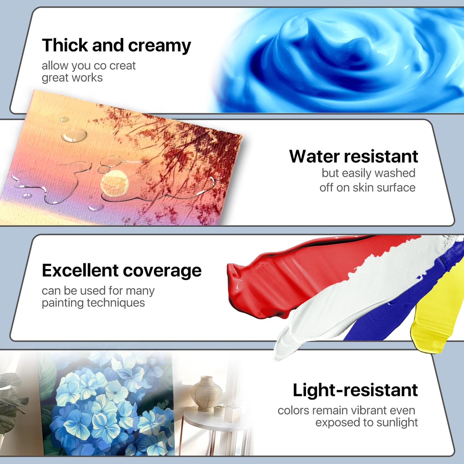 - PREMUIM QUALITY PAINT- These rich,vivid pigments glide on smoothly,dry quickly and stay as beautiful as the day they were painted, offer good coverage and a creamy texture for large areas and fine details. This Premium outdoor/indoor use craft acrylic paint is a good idea for professional artists