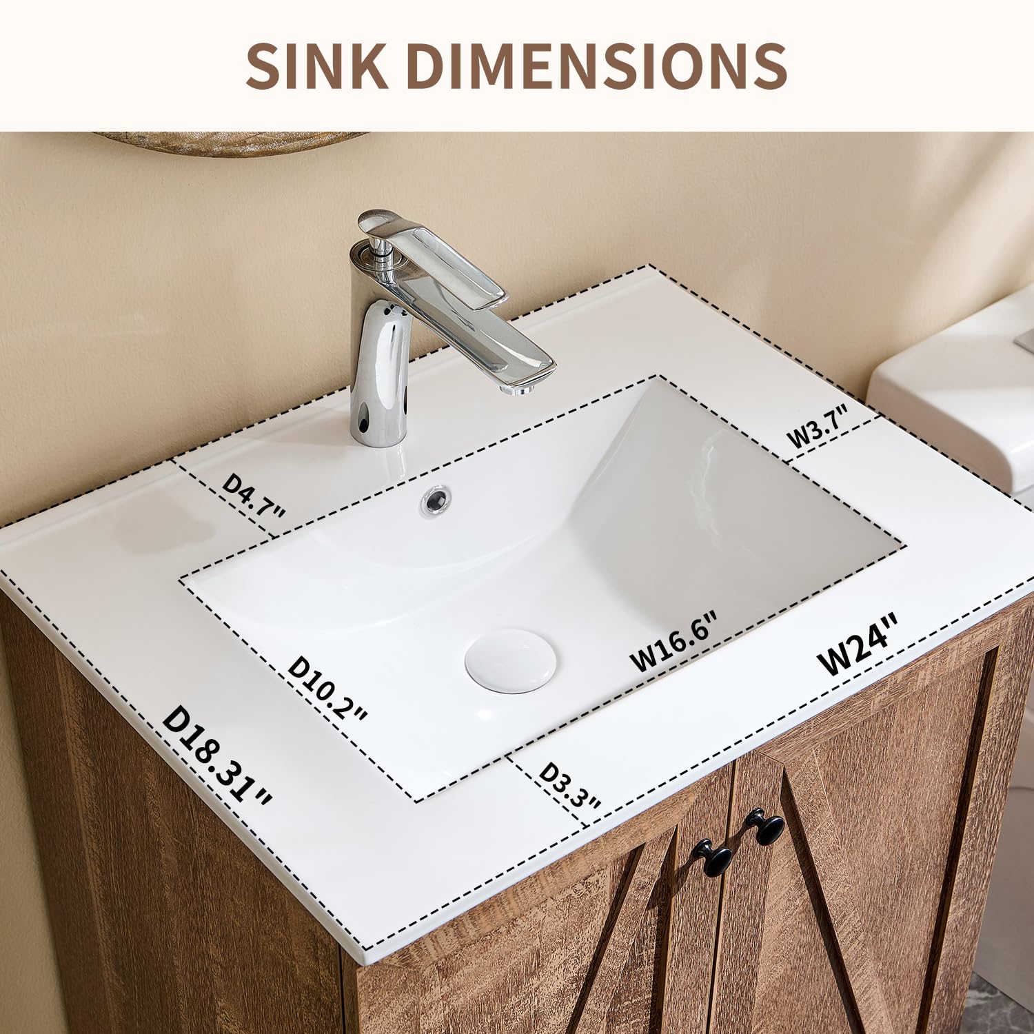 - 24" FARMHOUSE BATHROOM VANITY: Overall Dimension: 24" W x 18.31" D x 34.61" H. Sink dimension: 16.6" W x 10.2" D. Bathroom Vanity With Sink is made of quality MDF. Bathroom Vanity features a wood grain finish with a subtle texture that adds elegance and modern farmhouse style. Aitjunz Bathroom Vanity are made to last, suitable for any bathroom