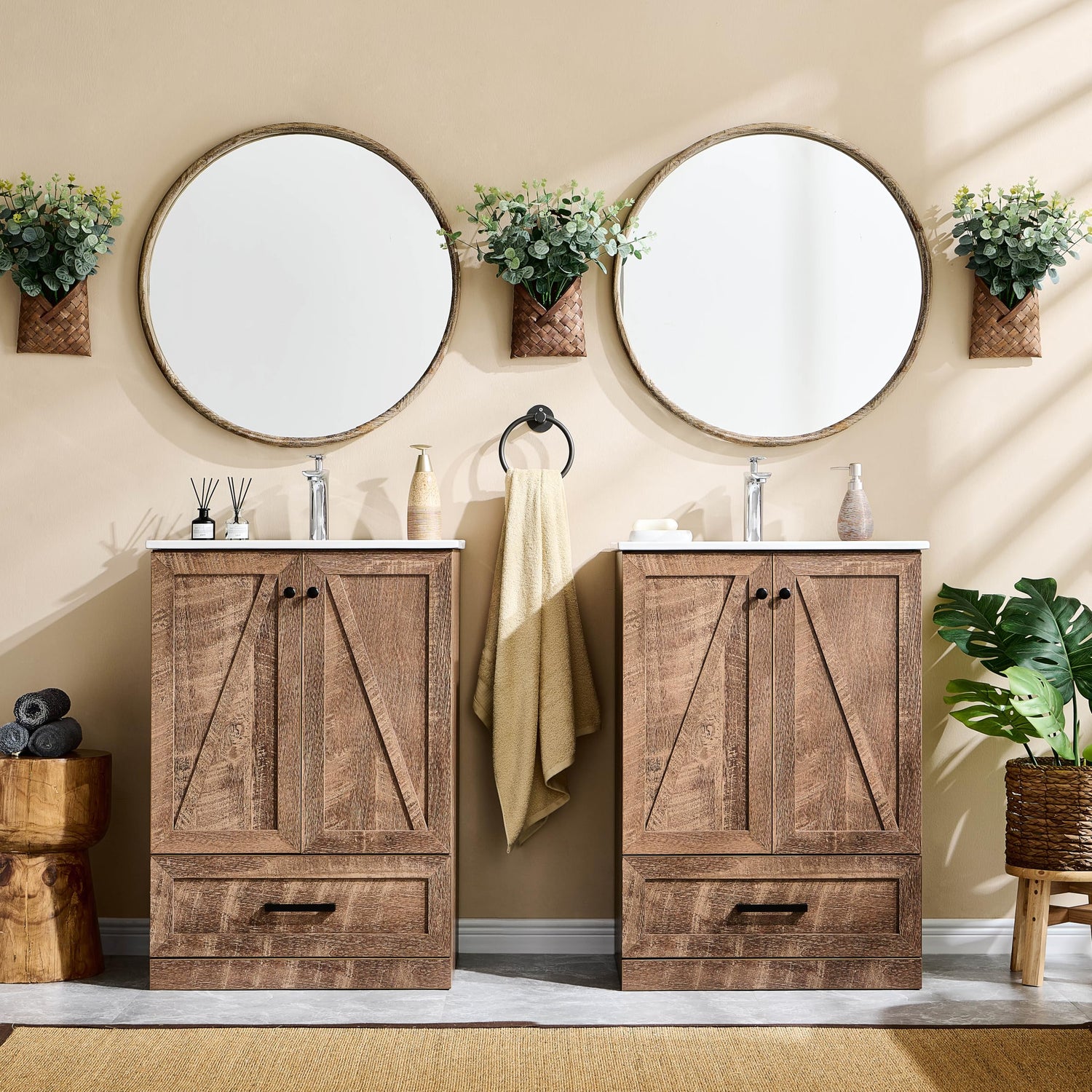 24" Farmhouse Bathroom Vanity with Sink, Bathroom Vanity Sink Cabinet with Large Storage Drawer, Modern Floor Standing Bathroom Vanity with Barn Door, Soft Closing & Metal Handle, Light Brown