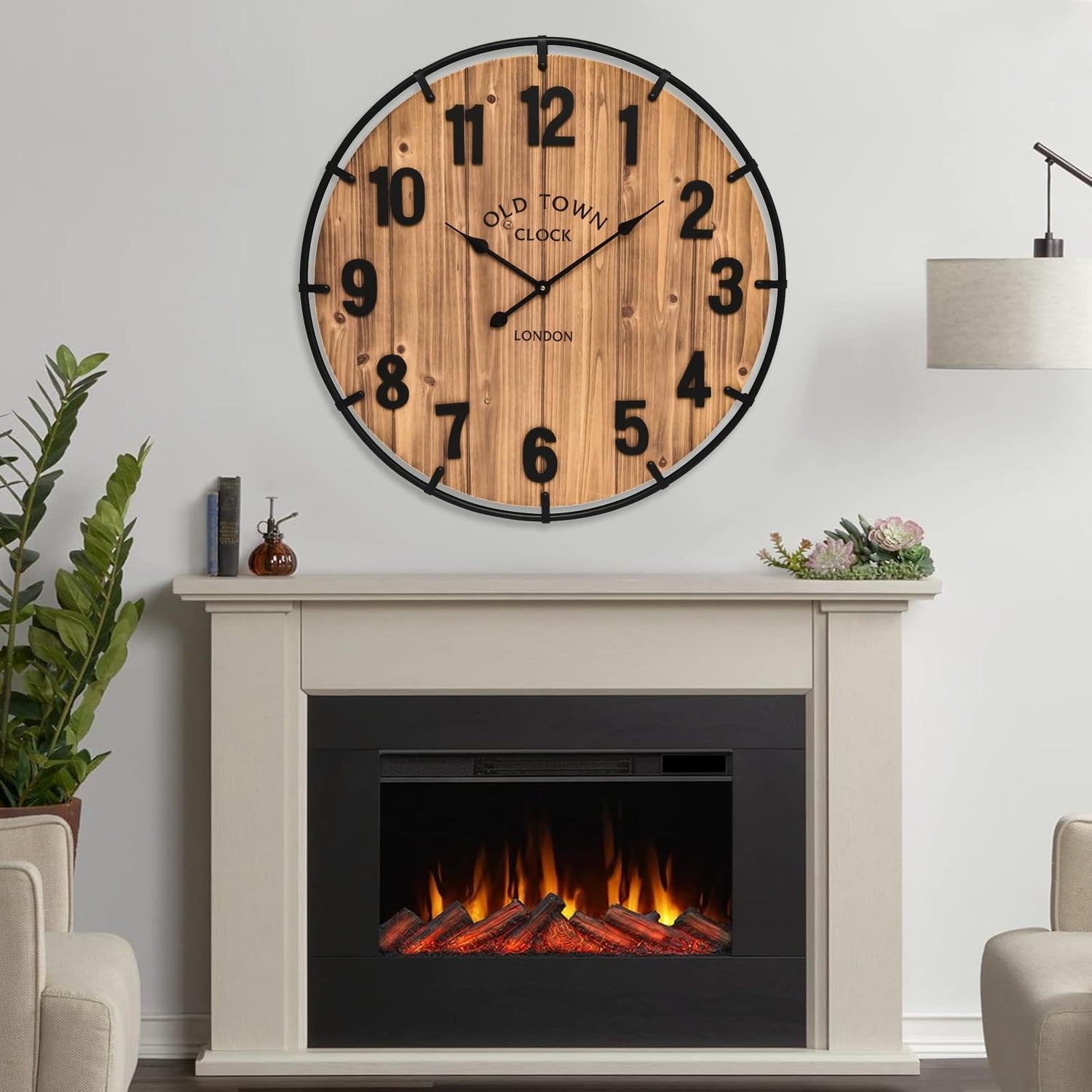 24 Inch Farmhouse Wall Clock Large Old Town Vintage Rustic Wooden Clock with Metal Rim and Large Numerals, Silent Battery-Operated for Office, Kitchen, Bedroom, and Living Room