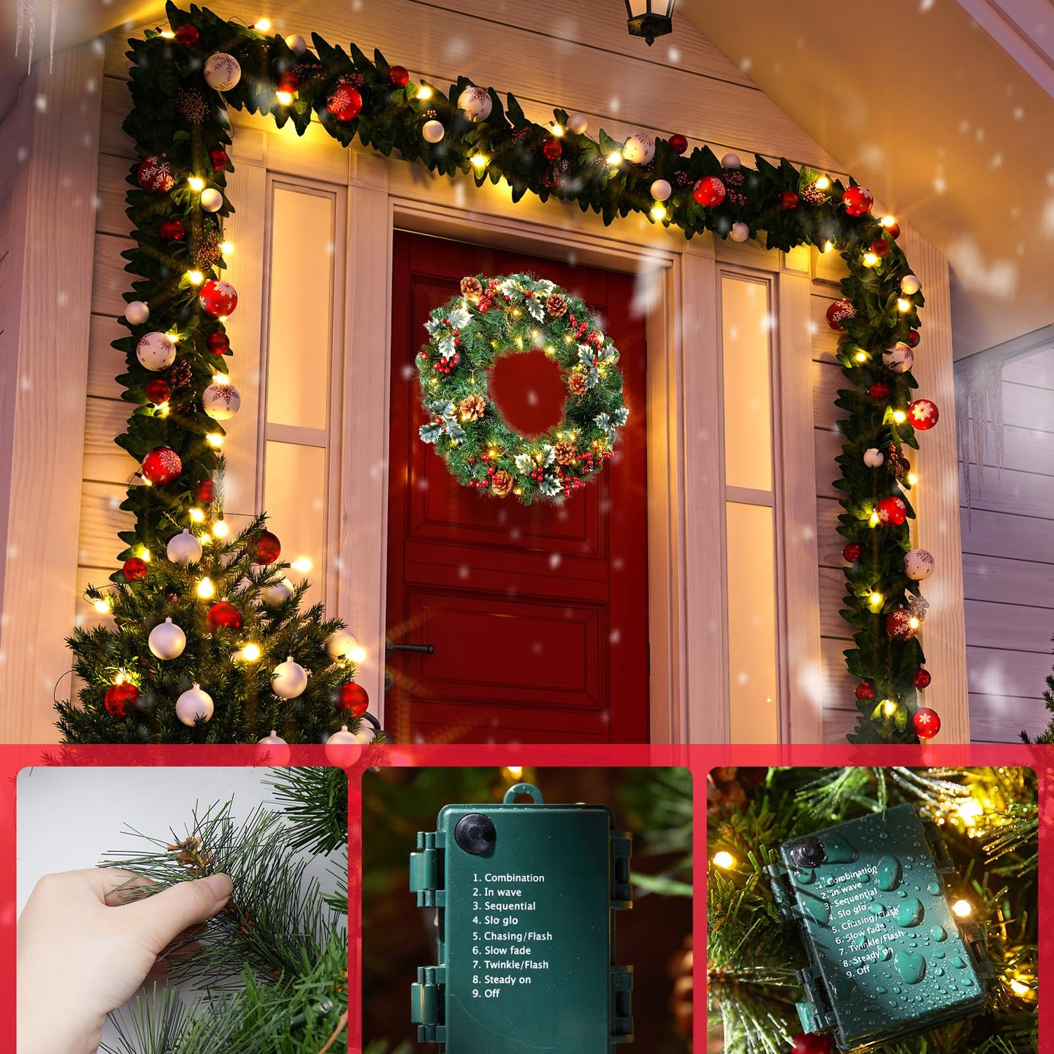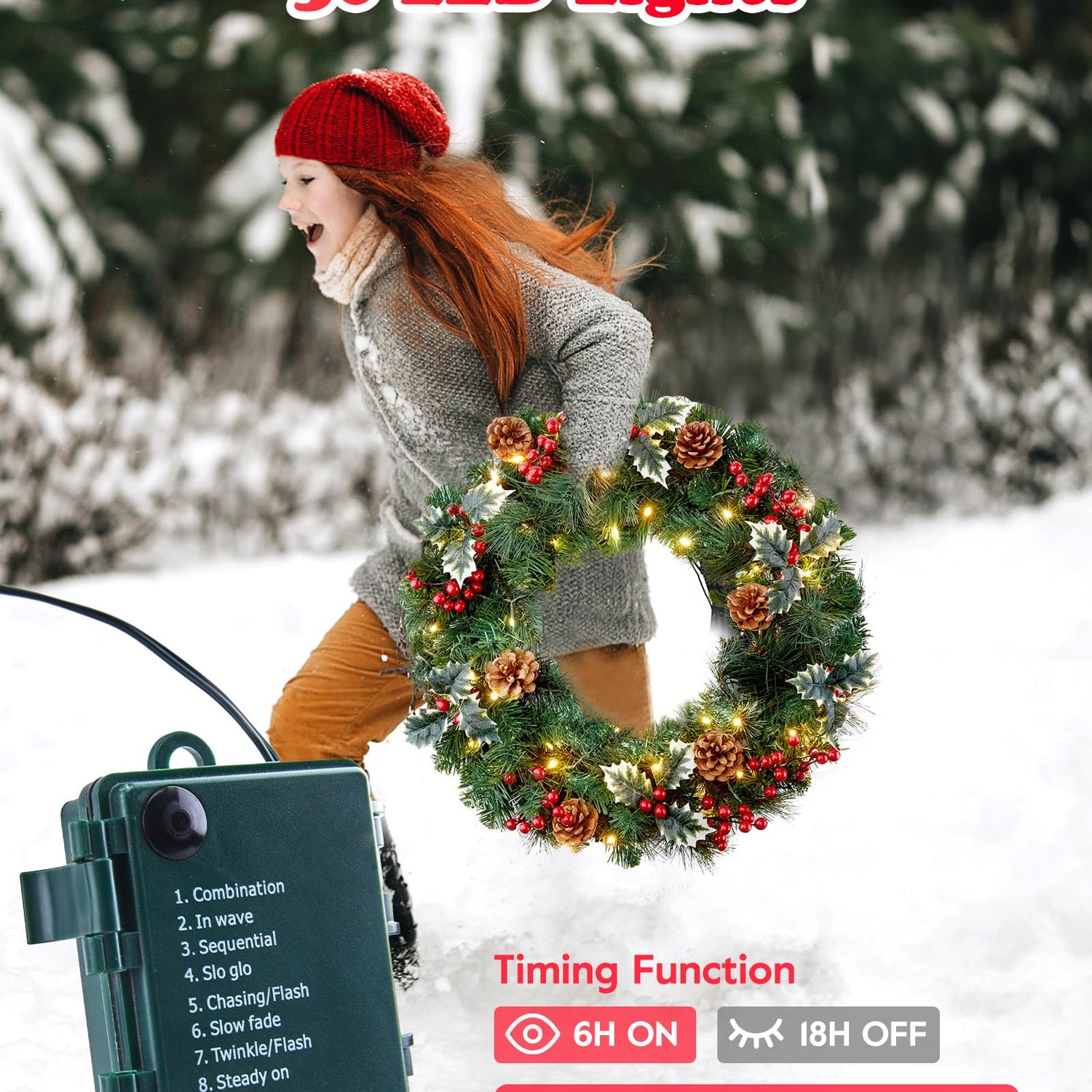 - 【Battery Operated & Timer Function Christmas Wreath】The pre-lit Christmas wreath lights required 3AA batteries (not included), batteries operated Christmas wreath allow you to place them anywhere without worry of needing plug socket. Comes with built-in auto timer function will automatic light for 6 hrs on and 18 hrs off cycle everyday help you save more energy.