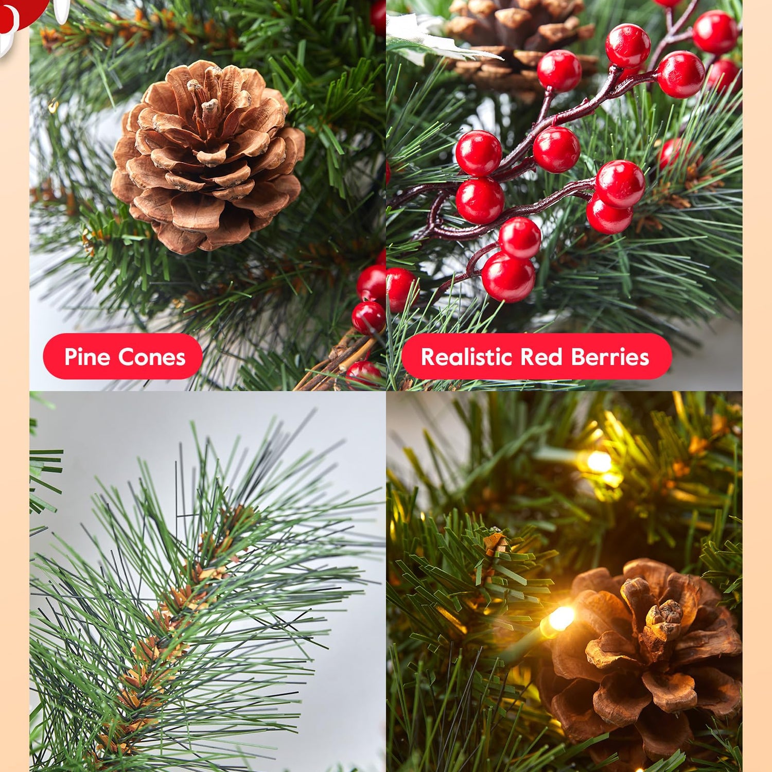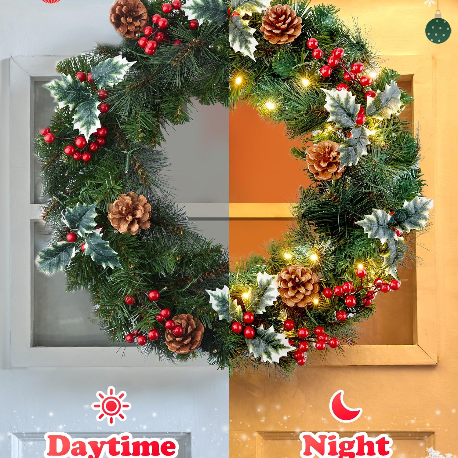 24 Inch Pre-Lit Artificial Christmas Wreath, Battery Operated LED Christmas Wreath with Pine Needles Branches Hari Leaves Red Berry Pine Cones Lighted Wreath for Front Door Wall Windows X-mas Ornament