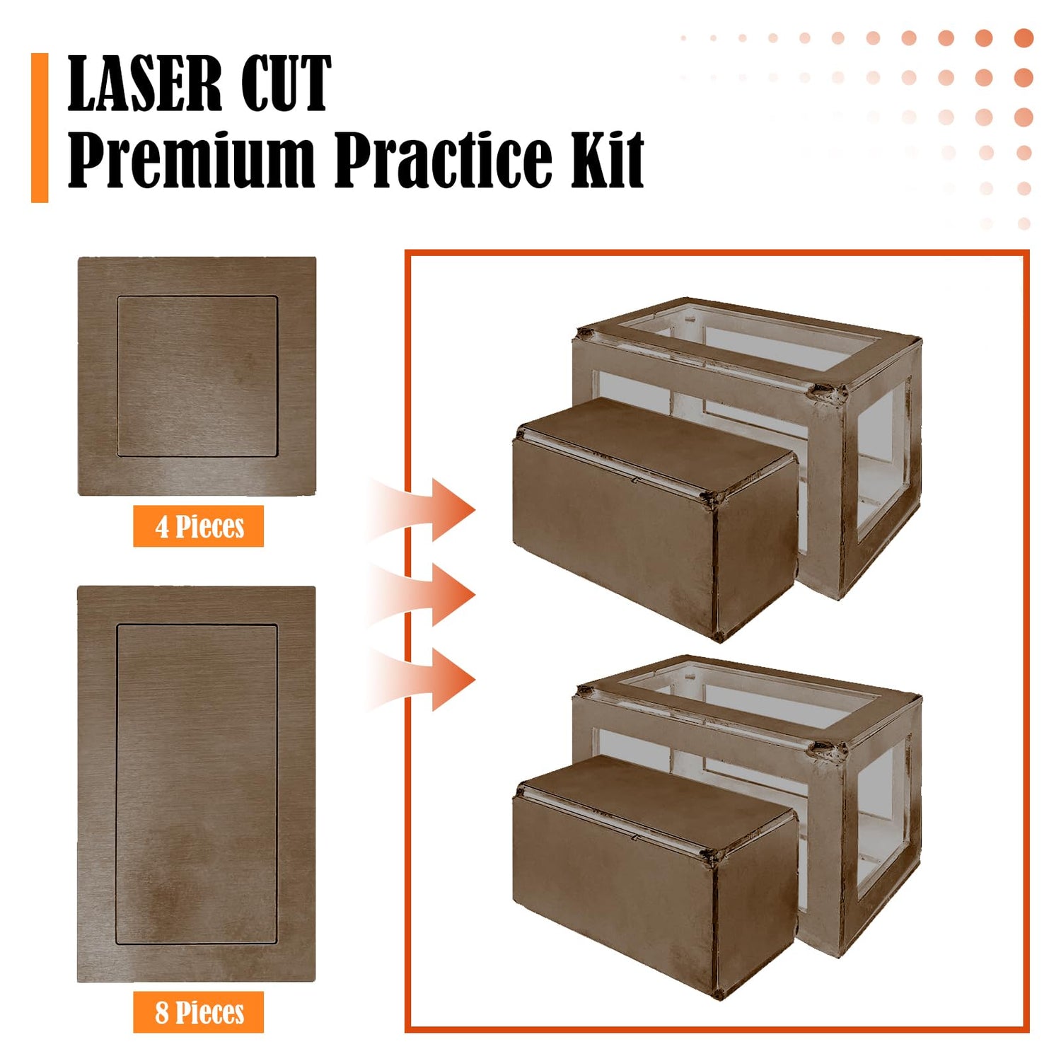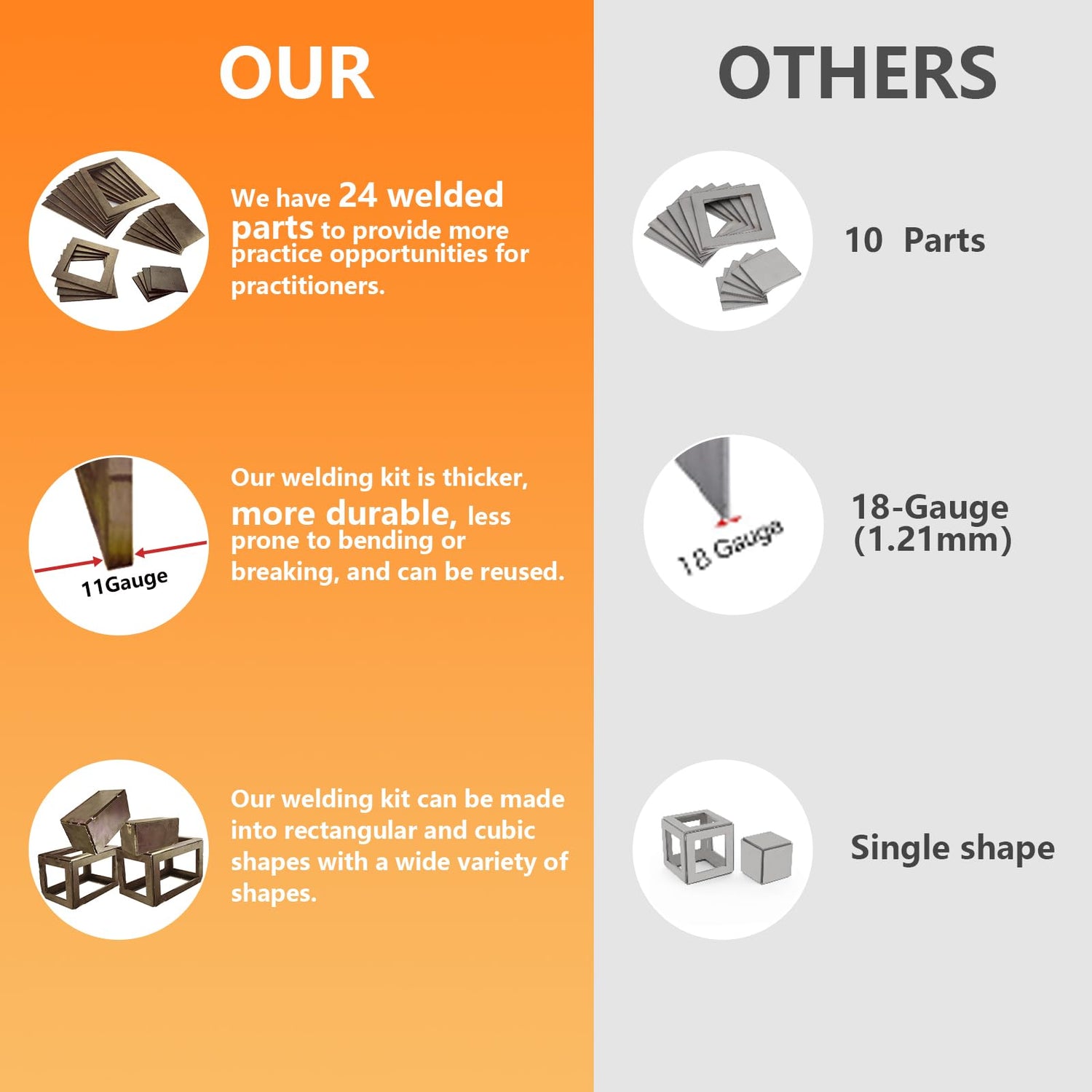 - MEASUREMENTS:The welding practice kit includes 8 pieces of 3x5 ", 8 pieces of 2x4", 4 pieces of 3x3 " and 4 pieces of 2x2".The welding coupons can be welded to two large cubes measuring 5x3x3'' and two small cubes measuring 4x2x2". Made of 11-gauge premium steel welding coupons.This welding practice kit can stack up to 232 inches of lap welding!A welding practice kit with a total circumference of 200 inches.We have 24 welded parts to provide more practice opportunities for practitioners.Money is worth it