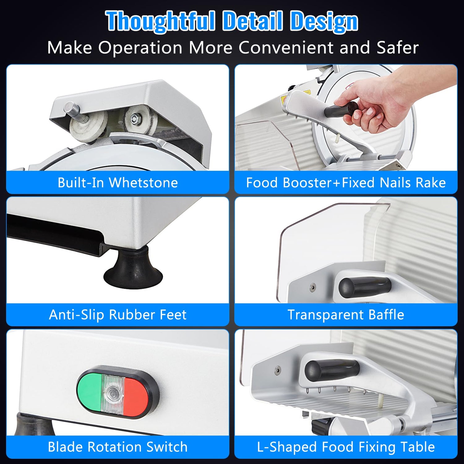 - 【Safety Protection Design】Our slicer machine is equipped with a hidden knife sharpener, which can safely sharpen the knife without removing the blade. The fixed transparent guard prevents accidental contact with the blade and ensures safety. Non-slip rubber feet ensure stability. The food pusher locks the meat securely and the handle is easy to operate.